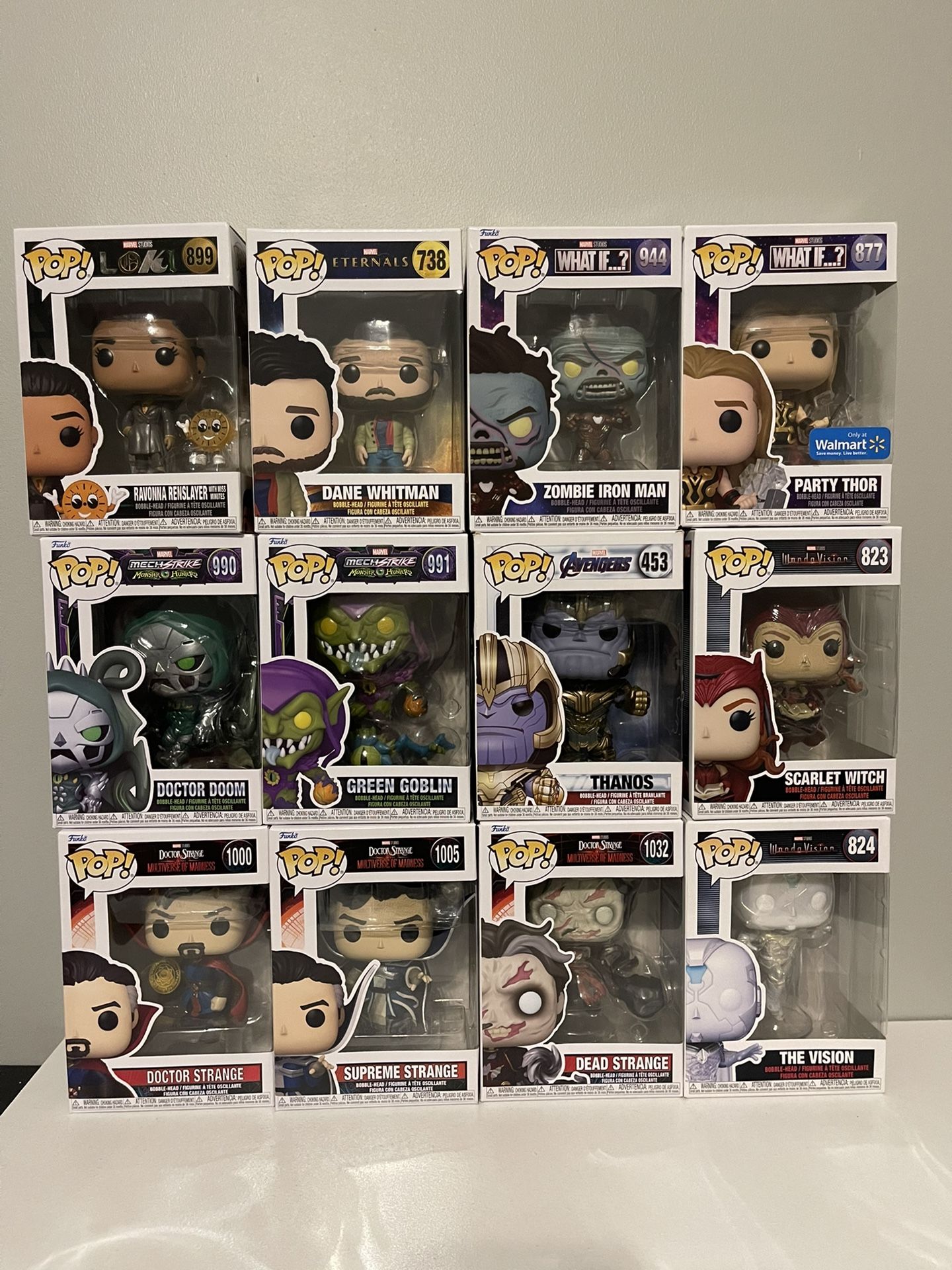 Funko Pop! Mix Lot Of 12 Marvel Brand New In Box Doctor strange, Wanda vision, mech strike, What if, Loki, Eternals, avengers Will sell individually just message which ones interested in.