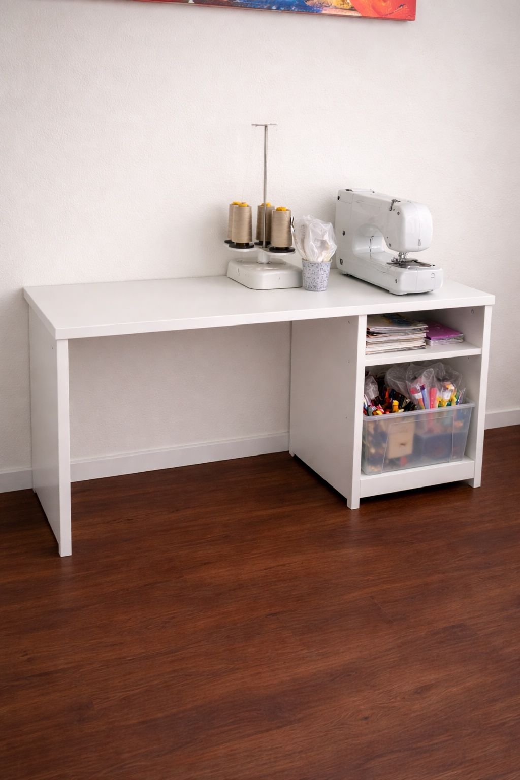 Minimal white storage unit with an open shelf design. Clean lines and sturdy build, perfect for organizing bins, books, files, or household items. Compact height makes it ideal for offices, closets, studios, or under windows. Clear storage bins shown are not included.