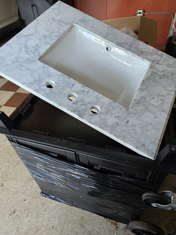 Vanity with marble sink. It is 30 in. wide X 22 depth.