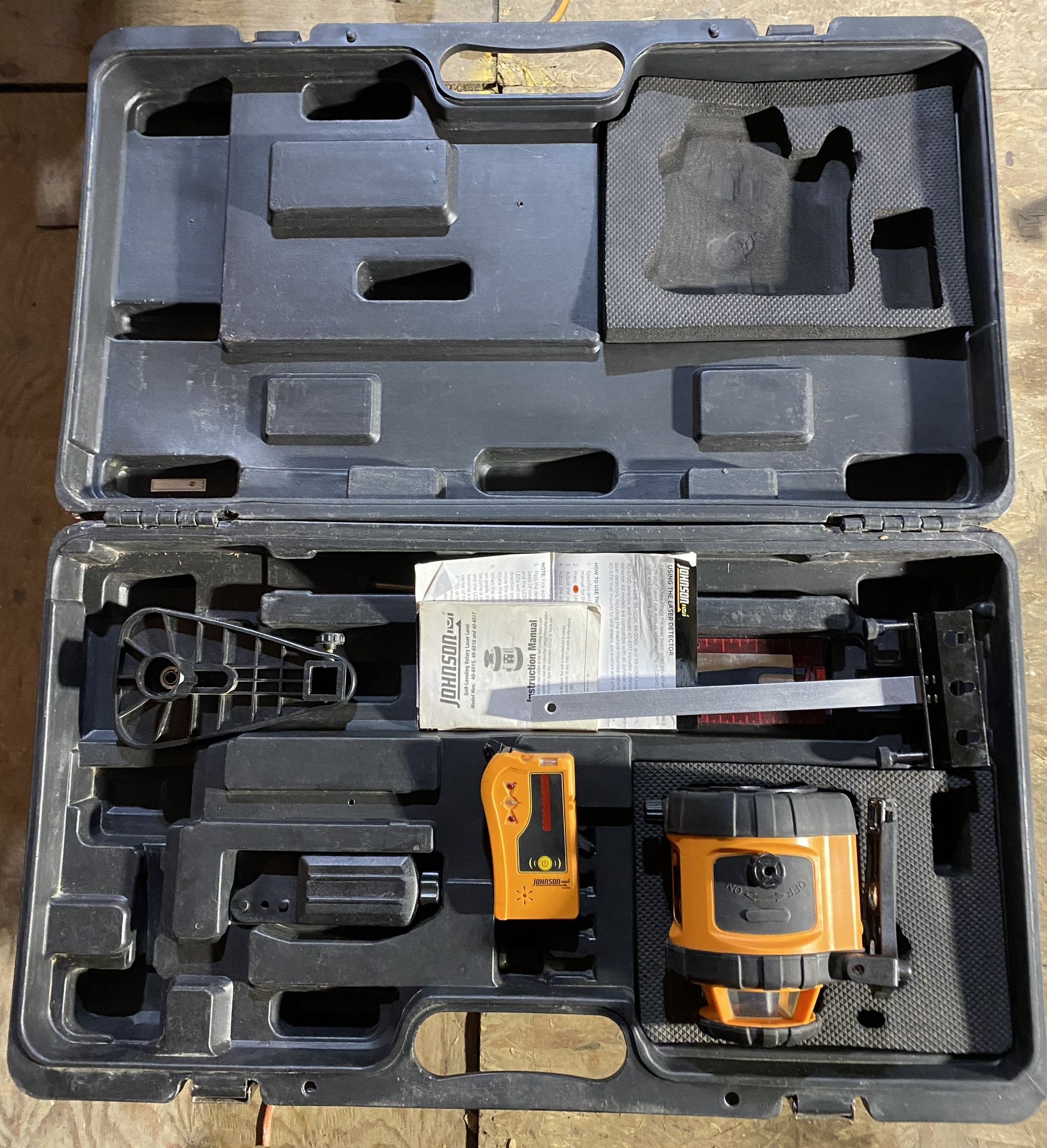 Johnson Self-Leveling Rotary Laser Level Model # 40-6517 Includes - Laser level, Laser detector, Wall/ Ceiling mount attachment, Magnetic target, Measurement rod, & Case. Unfortunately the tripod is not included. Tripod can be bought separately for approximately $55. Everything cleaned up, new batteries and works great. This is a very nice rotary laser level and retails new for approximately $600 after tax. I’m offering an exceptional deal at $225. It’s ready to go to the job site & get to work right away.