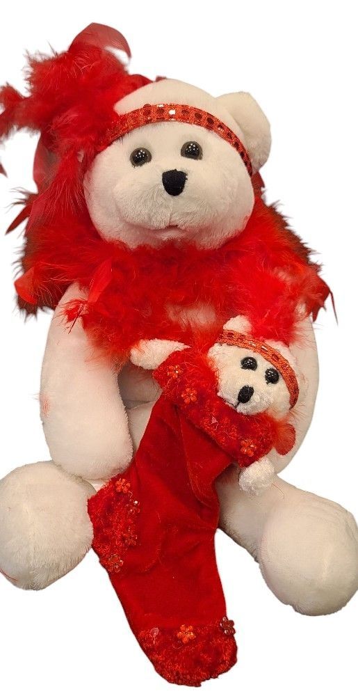 This glamorous, muscial white teddy bear is ready to steal the show—and your heart! Dressed to dazzle in full flapper fashion, she features a sparkling red sequin headband adorned with a bold red feather, and a fabulous red feathered boa draped around her shoulders for that perfect vintage flair. With her soft white fur and elegant style, she’s an eye-catching collectible full of personality and charm. But the real showstopper? Press her paw (batteries not included), and she’ll sing the classic tune “I Want To Be Loved By You”, made famous by Marilyn Monroe—while her head and mouth move along with the music! There's also a convenient on/off switch underneath her to control the performance with ease. It’s an adorable performance that brings her sassy flapper spirit to life! As a sweet bonus, she also comes with a matching “mini me” red-and-white flapper-style stocking that completes the look! In great pre-owned condition. She's ready for her new forever home. Perfect for: Teddy bear collectors, vintage lovers, musical plush fans, or anyone who enjoys unique, one-of-a-kind pieces with flair and character. ***Unable to add a video of her singing to the listing on OfferUp. Please let us know if you would like to see the video, and we can try to send it to you directly. - Pick up North Stockton - Shipping option is available