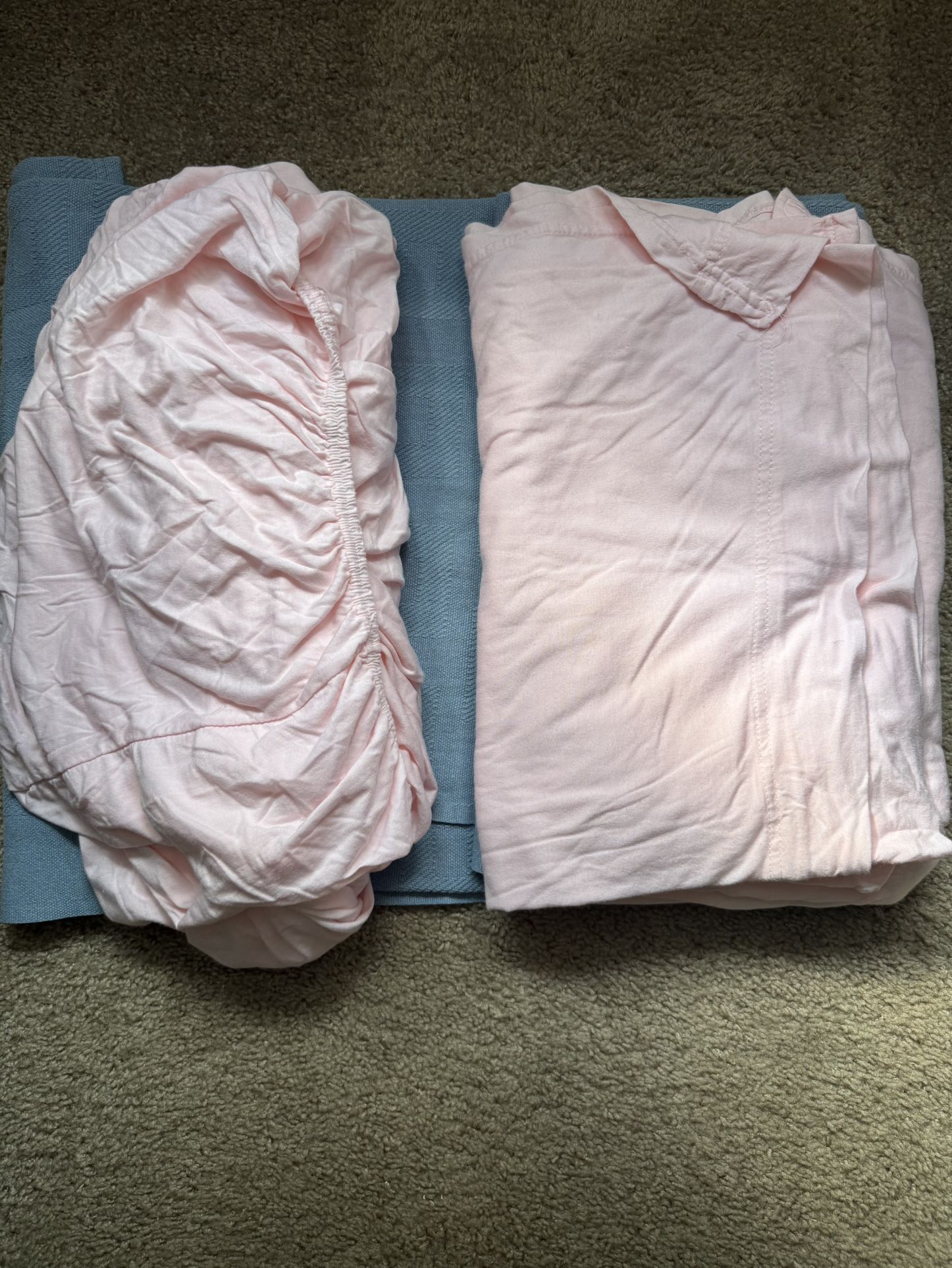 Pre-owned items well cared for, excellent condition, no stains, no tears, no pills. COTTON • BLUE WOVEN COTTON BLANKET/THROW apx. 81”L x 68”W • LIGHT PINK SHEETS: Bed Bath & Beyond 2 Piece Queen set 100% Cotton Flannel ULTRA SOFT COMFY •Manufactured by Zorlu. RN 102590 •Machine washable / Tumble Dry Features: * 100% Woven Cotton * Set includes 1 flat sheet, 1 fitted sheet * Lustrous softness, feels tee-shirt soft * 15” depth Fully elasticized Fitted sheet Condition: Excellent, Well Maintained, Clean, Pet Free Smoke free home! Super Comfy Soft
