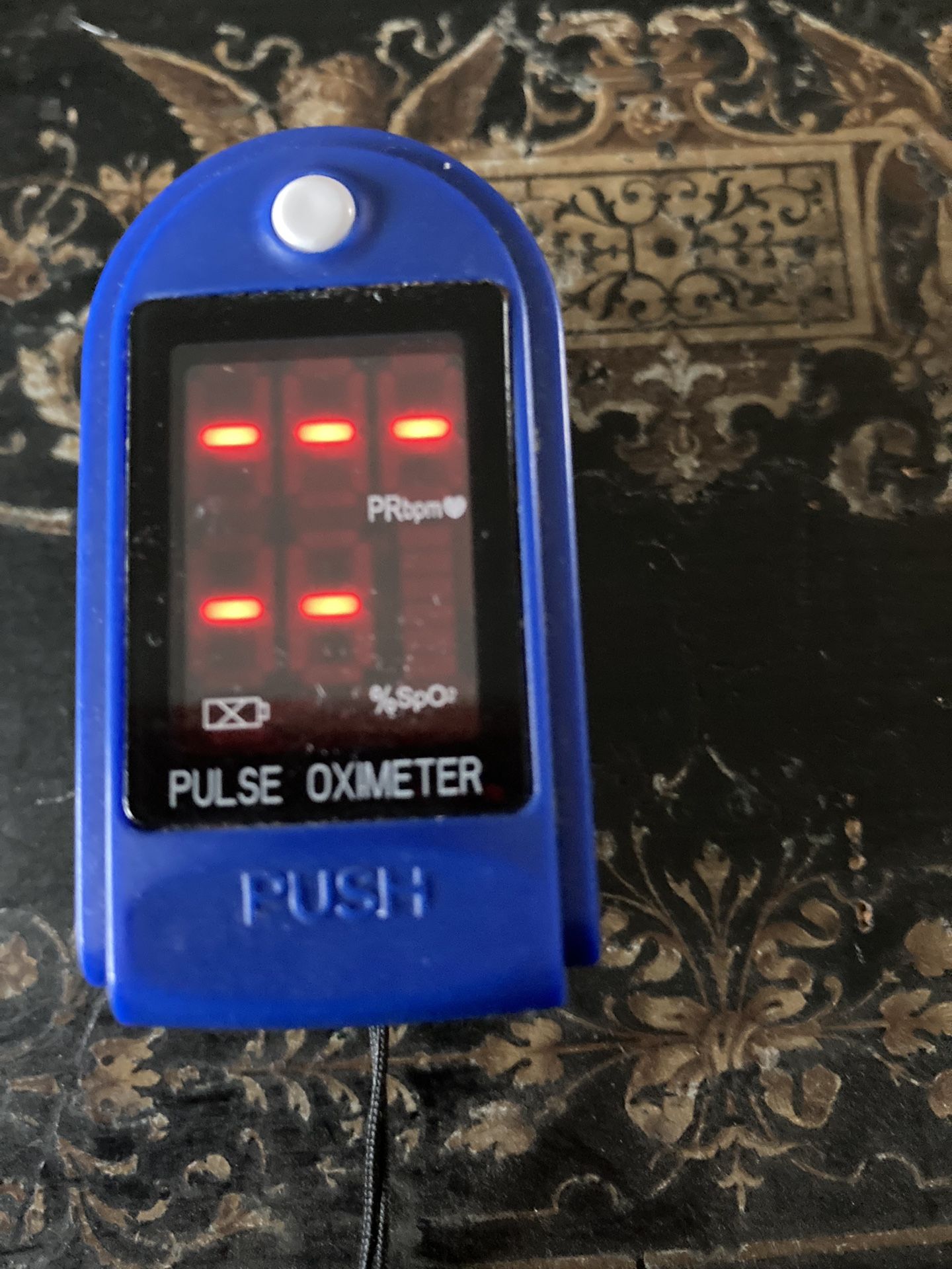 Measures heart rater & oxygen blood levels from finger tip. Good clinical device. Runs on a battery.