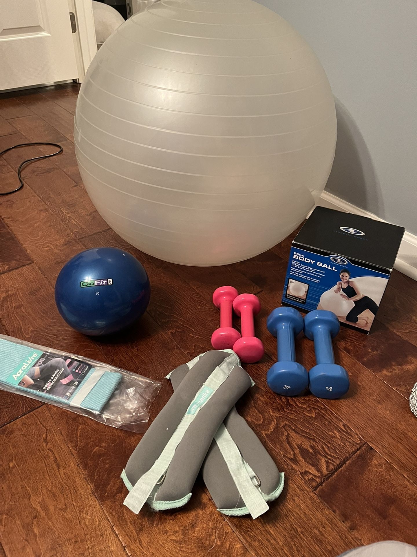 Ball, 8-10 medicine ball, 4 lb ankle weights (used once), resistance band (new), 2 lb pink weights, 5 lbs blue weights.