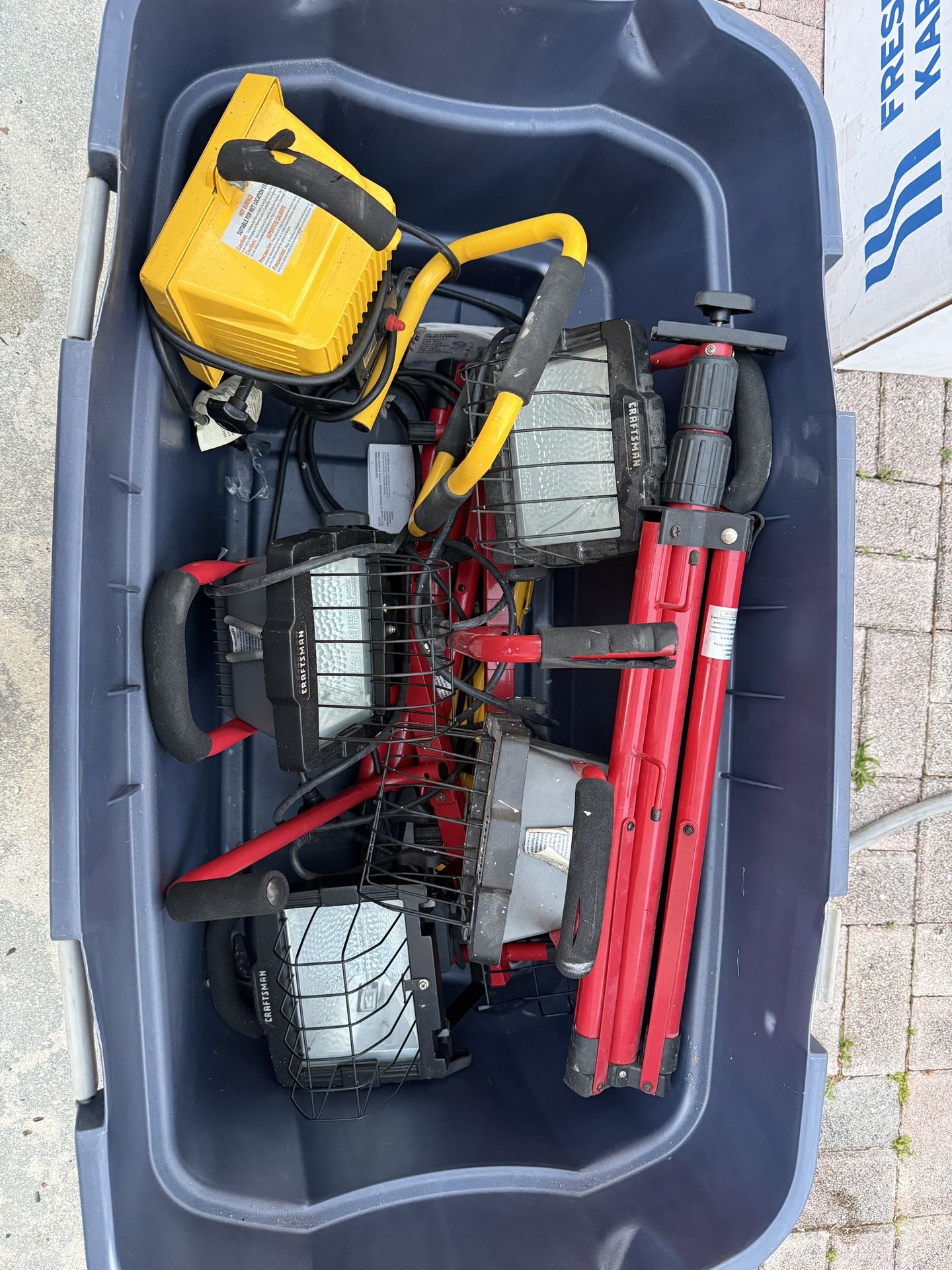 Everything you need for your next project! Includes heavy-duty halogen work lights on stands, portable handheld light —all in great shape. Priced to move! Ideal for pros, DIYers, or backup gear! Brighten up your job site! Includes dual-head work lights on adjustable stands, a portable yellow utility light, and charger. All stored in a sturdy bin for easy transport. Perfect for garage projects, reno work, or job sites. Comes with 3 work lights (including Craftsman double-head), an extension tripod, and a charger. Works great!
