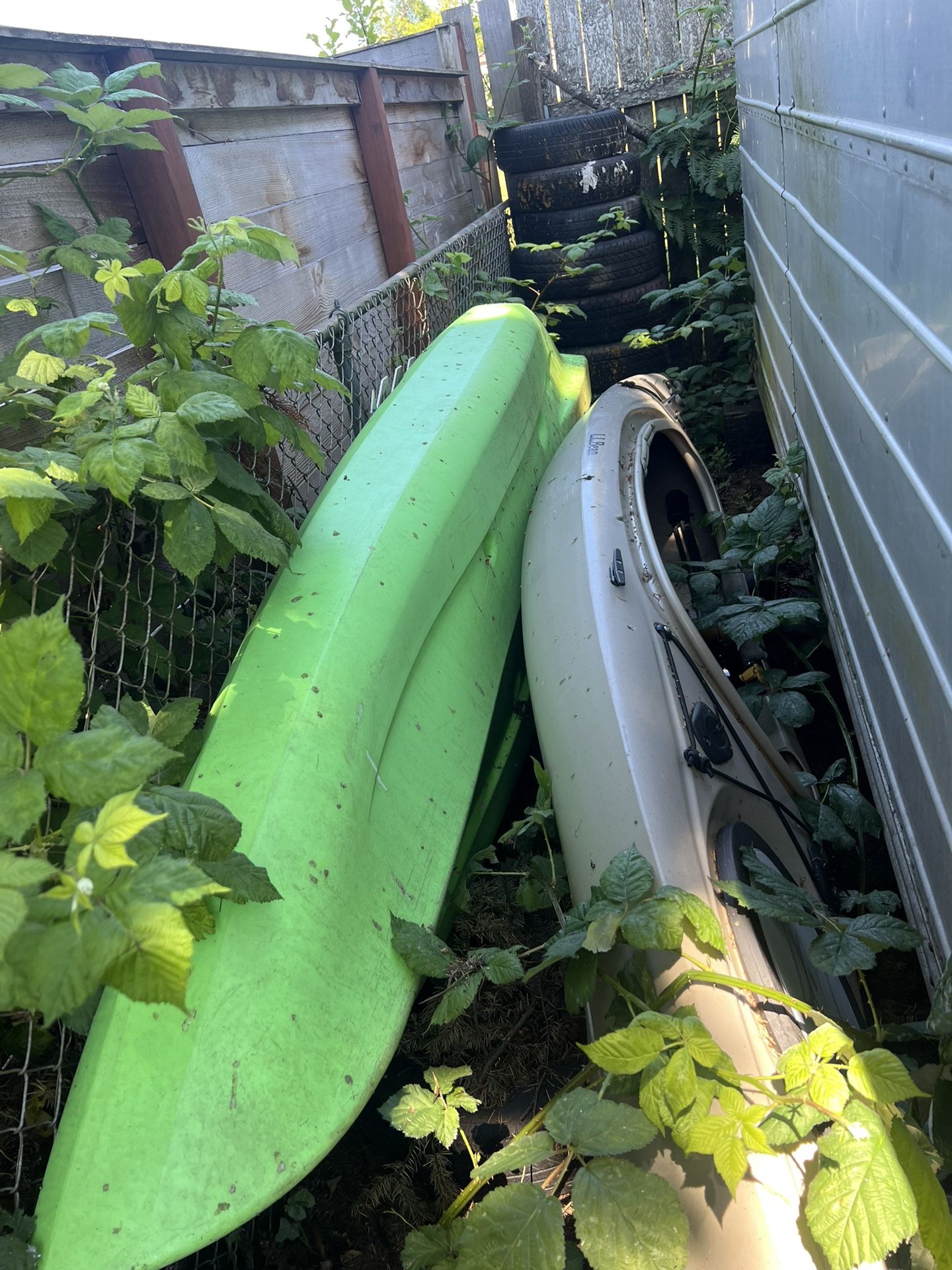 One regular green kayak and one fishing kayak with accessories for fishing like fishing line holder ect. Needs to be cleaned and will be like new