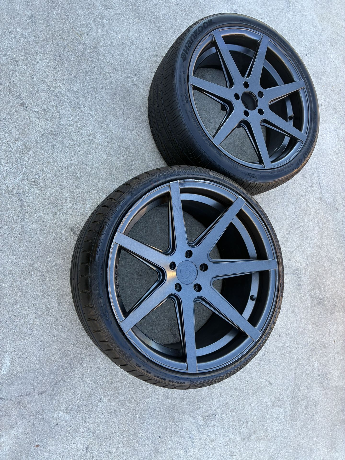 Rims 20 staggered ONLY 2 Rear 20x11 tires 285/30/20 Front 20x8.5 tire 235/40/20 All 2 good tires 90% and 80% life 5x114.3 bolt pattern $150 cash for both