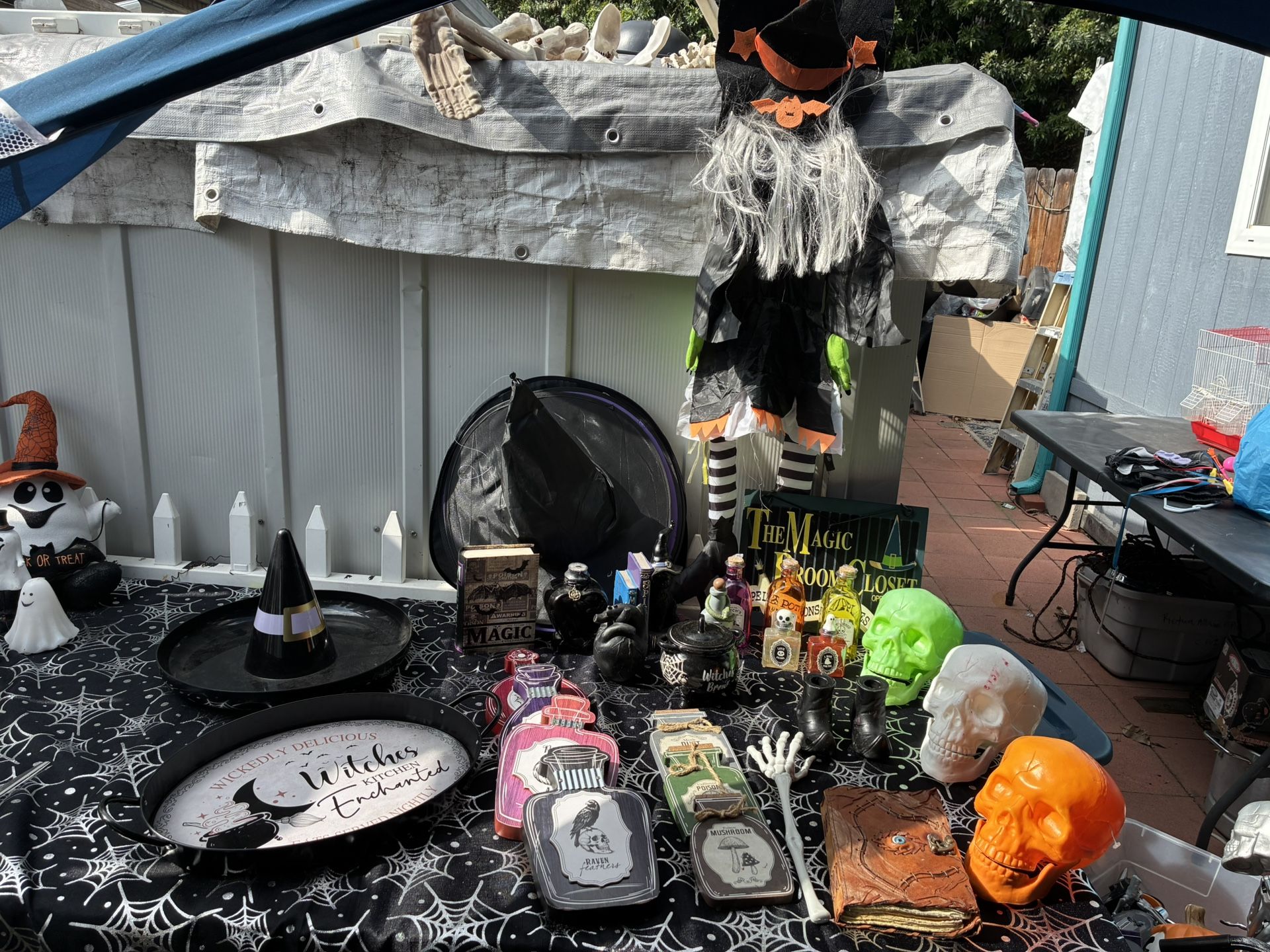 More than 30 pieces in this picture About 6 witch hats, book, trays, hanging witch Poison bottles Skulls & more Book SOLD Tray SOLD Color Potions SOLD I used it for hocus pocus theme decorations last year selling all of it together asking for $20