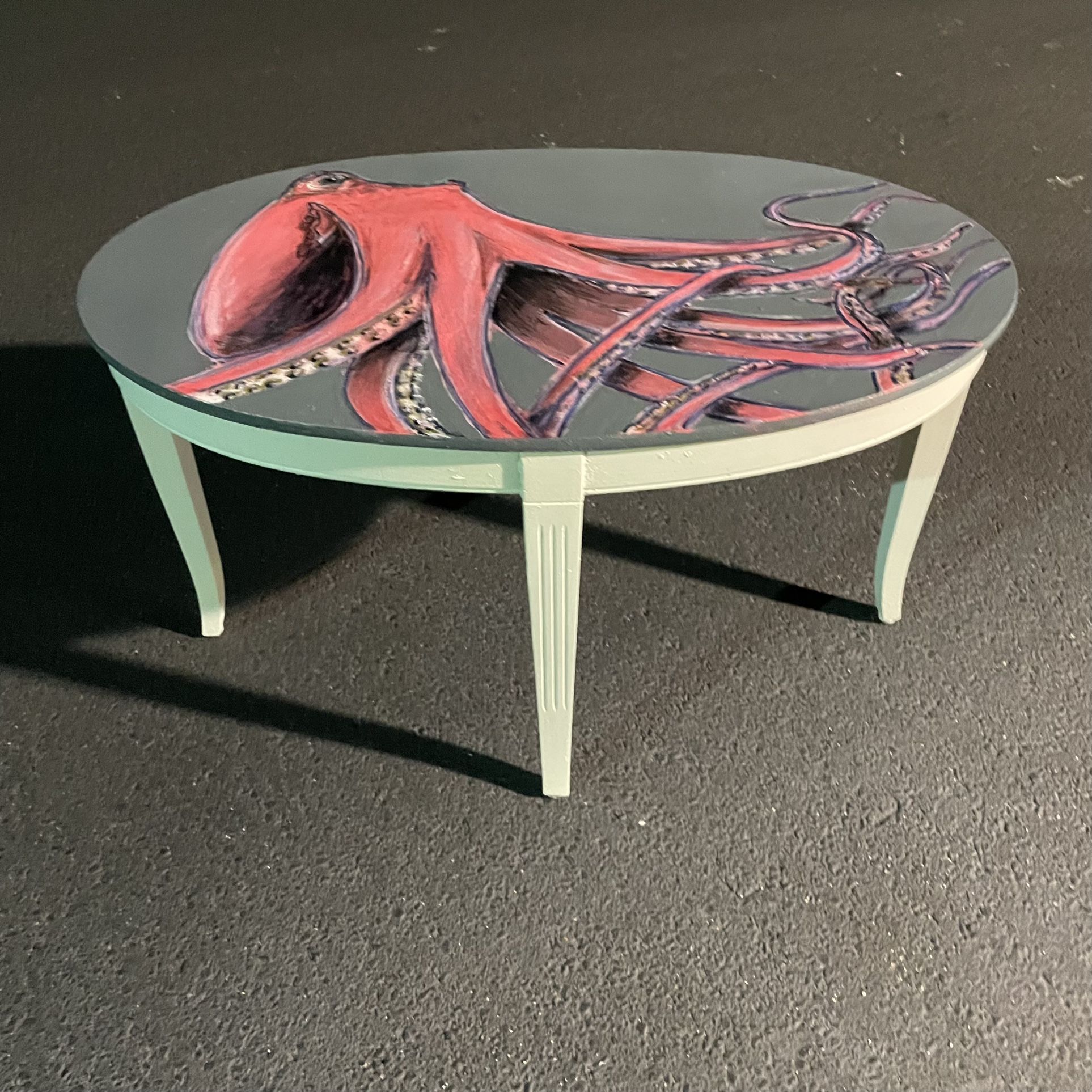 Hand Painted two tone Empire accent table with scarlet and rose octopus art painted on top with a grey background, and a parchment colored painted base. Painted by local artist Brian White. Dimensions are 28.3” wide x 17.5” deep x 16.3” tall. Pick up in Indian Harbour beach. Delivery available if needed.