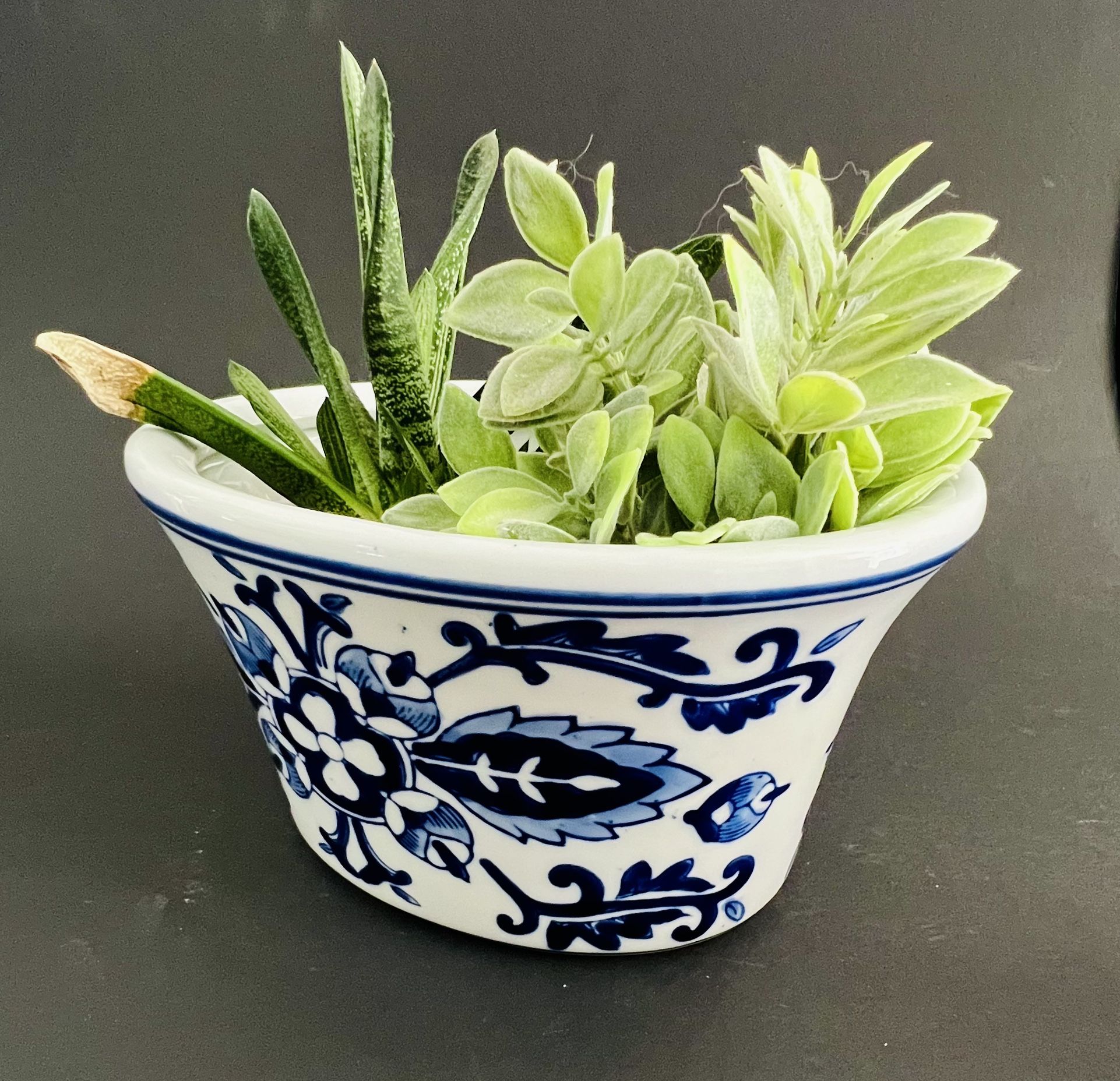(Any Reasonable Offer Will Be Accepted) Blue and white planter with drain hole 7”x10”. Height 5-1/2” Indoor / Outdoor (Plants not included)