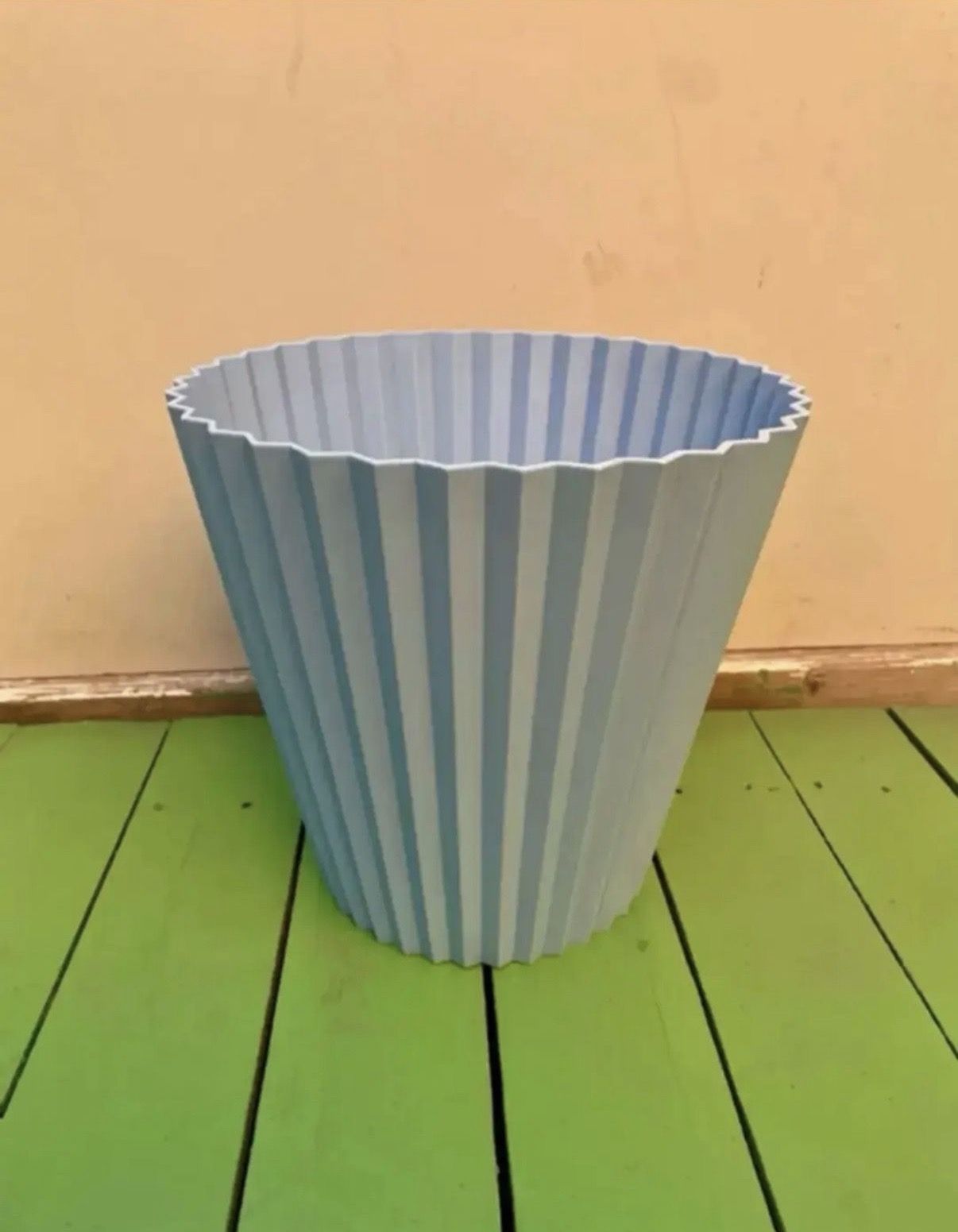 Vintage baby blue pleated ribbed plastic wastebasket #4836 from Fesco USA. Marked on base: Fesco 4836 vintage, retro, mid-century, and collectibles. good condition