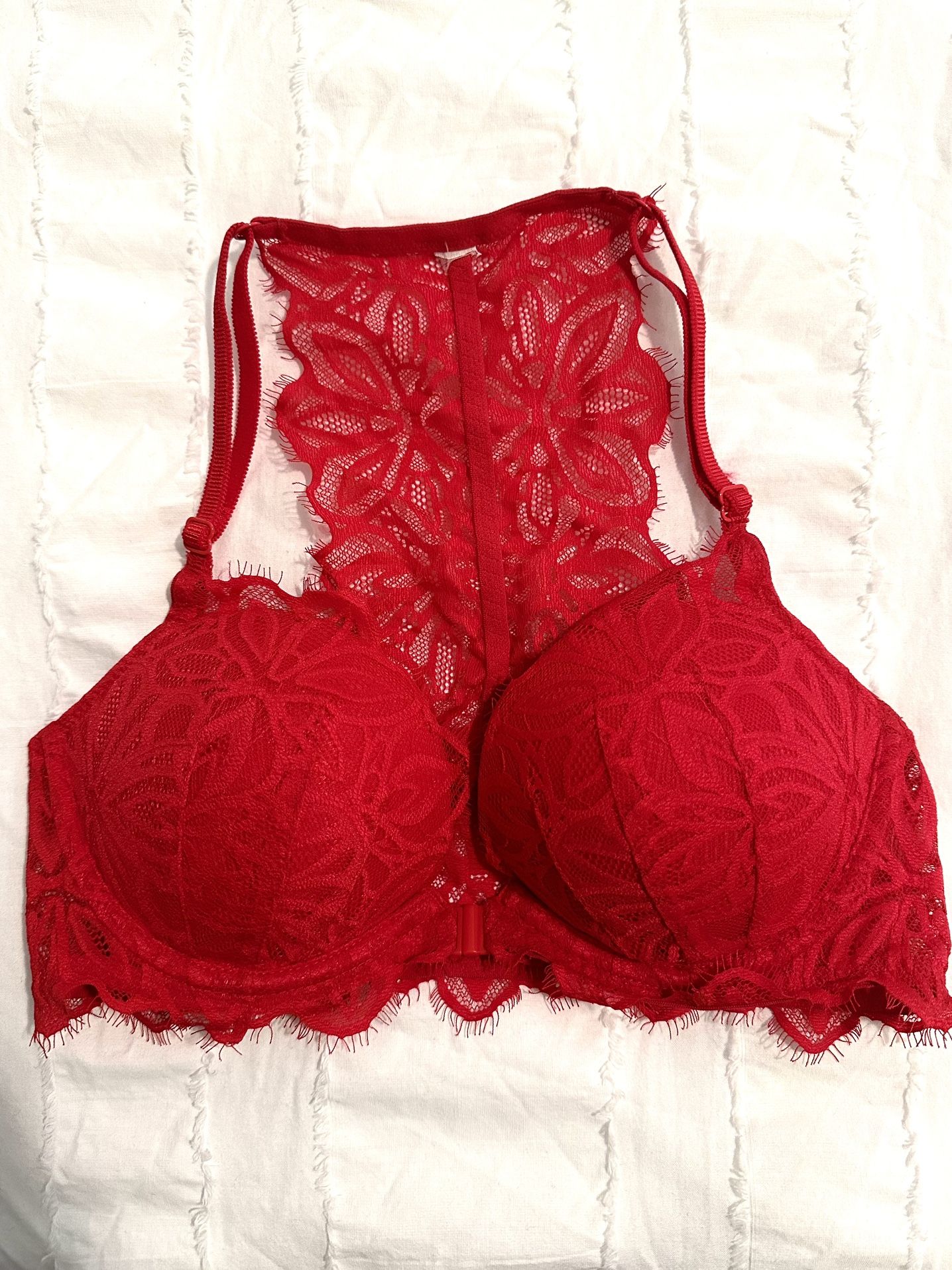 Beautiful red lacey push-up bra from Victoria’s Secret. Size 32c (push-up makes it fit more like 32b). !!!ALL CREEPY MEN MESSAGING ME WILL BE REPORTED IMMEDIATELY!!!