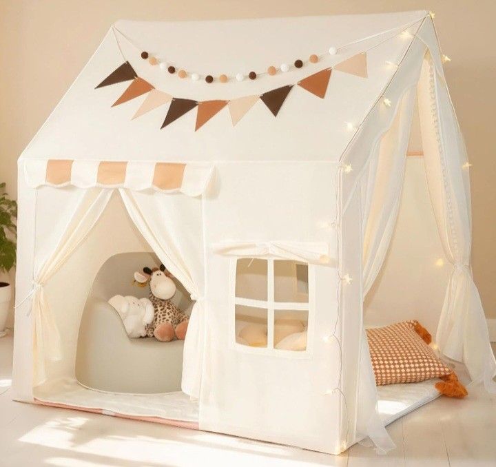 Owzee Kids Tent Indoor with Star Lights, Flags, Pompoms. 2-in-1 Toddler Tent Indoor with Metal Frame, Play House for Kids Indoor, 40"x47"x50", Toy Gifts for Toddlers. Details kids indoor tent features a upgraded metal frame (no flimsy PVC!) for long-lasting durability. It withstands rough play, making it the perfect indoor n outdoor kids play tent. Soft yet strong fabric offers a cozy feel to keep playtime cool and comfortable. Machine washable for effortless l. complete with string star lights and decorations. Also comes with a carry bag for convenient storage and travel, this toddler tent is the perfect gift for birthdays, holidays, Christmas, or just-because surprises! 【Charming 2-in-1 Design】: Our toddler tents indoor boasts a versatile 2-in-1 design with 2 open sides. Gender-neutral color makes it a perfect fit for both boys and girls. It’s an essential piece of kids' furniture that inspires endless fun. 【Multi-Functional Use】: Measuring 40” x 47” x 50”, this large play tents for toddlers offers plenty of space for 3-4 kids or even an adult to join the fun. Can be used as a reading nook, a playhouse, or a cozy nap retreat—it’s also perfect as a outdoor picnic tent or classroom activity tent. It even helps toddlers feel secure as they transition to sleeping on their own.