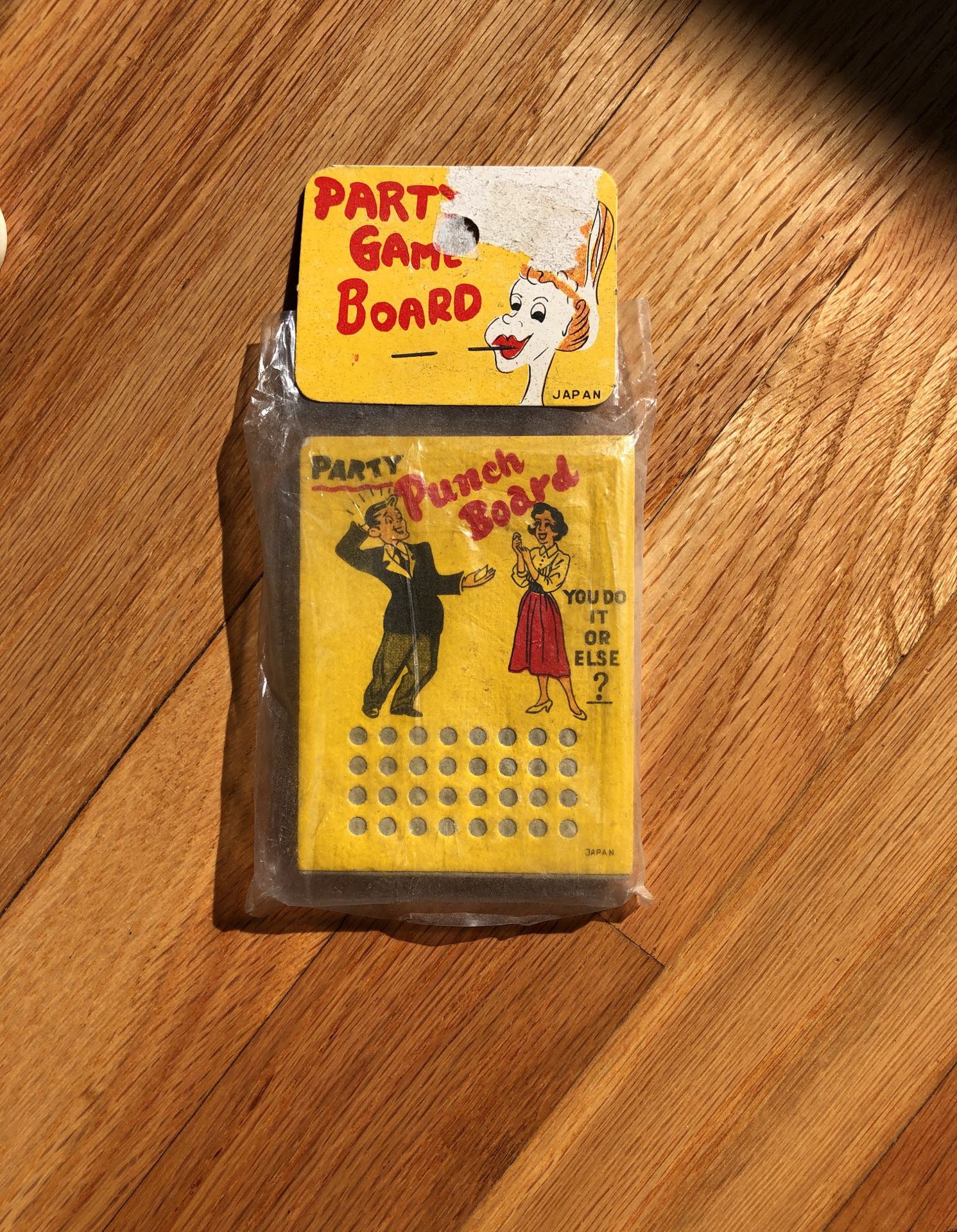 The metal punch is still in the back of the game board. Use the punch to push the roll of paper out of the board. Marked Japan. 2 1/2” x 3 1/2. 32 punches on the card.
