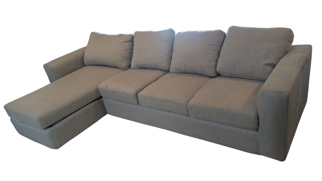 Left side facing chaise sectional 115" across and chaise 64", only used for 1 year, has some abrasions on the side of right arm (opposite of chaise).
