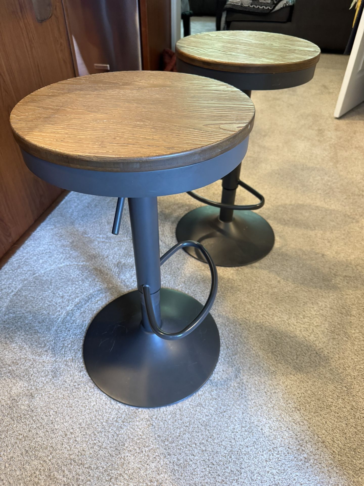Set of 2 swivel bar stools for $85 total. Adjustable from 26” to 31.5”, so will work for counter-height or bar height counters. “Dakota gray” color. Wood and metal. Very good condition.