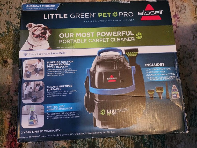 This portable carpet cleaner is designed for pet messes. It includes a 3" tough stain tool, a pet stain tool, a spraying crevice tool, and an 8 oz Pet Pro Oxy Urine Eliminator formula. It cleans multiple surfaces like carpets, upholstery, and car interiors. Great for detailing. Brand new. Never used or opened.