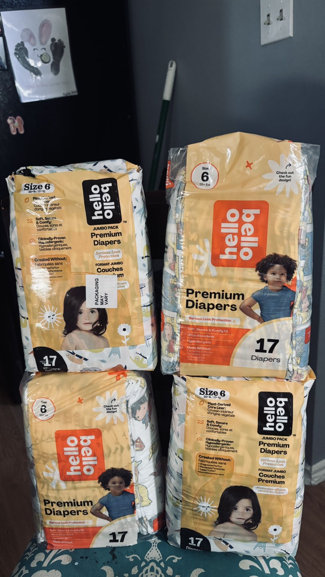 I’m selling these hello Belllo 17 count size 6 diapers for only $10 each or two packages for $15
