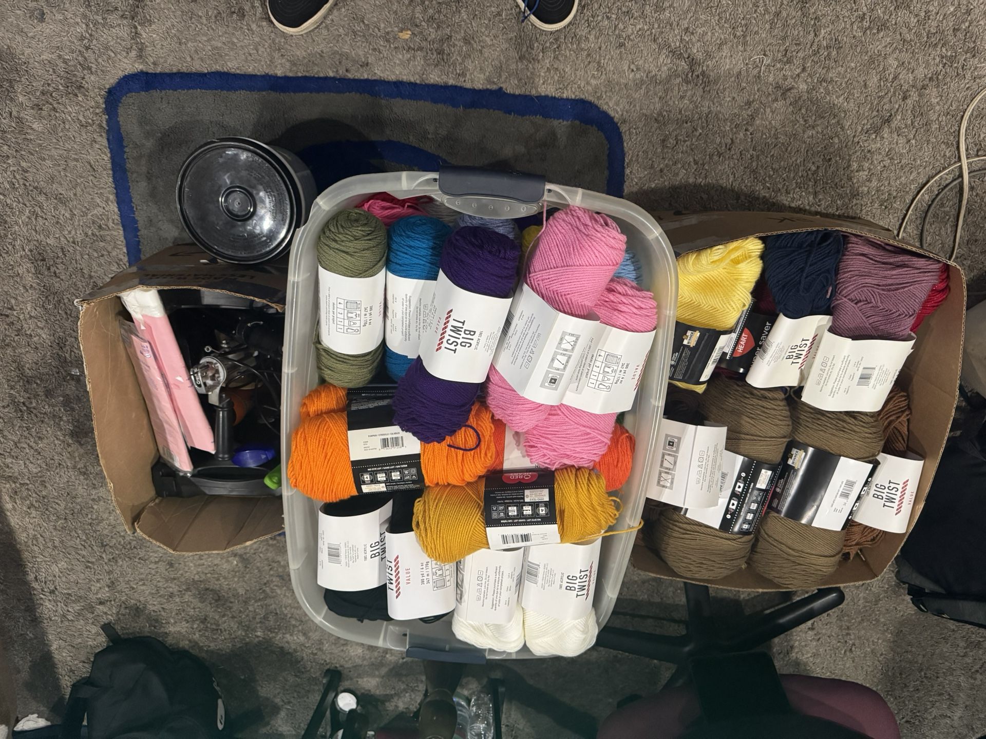 EVERYTHING YOU NEED TO MAKE A RUG!! -I dont have all the pics yet but i have everything you need to start Tufting rugs (you’ll just need the frame) -Spent about $700+ on everything (this deal is a steal) but definitely made my money back! Good hobby for extra cash 1. Sooo much yarn of all colors (80-100 skeins) 2. Tufting gun 3. Projector (for tracing) 4. 2x Carpet trimmers w/ 2x shaving guard 5. Alot of Extra backing fabric and some tufting fabric 6. Adhesive spray 7. Fabric scissors 8. Tweezers 9. Yarn spool 10. Carpet Febreeze 11. 1/4 tub of carpet glue