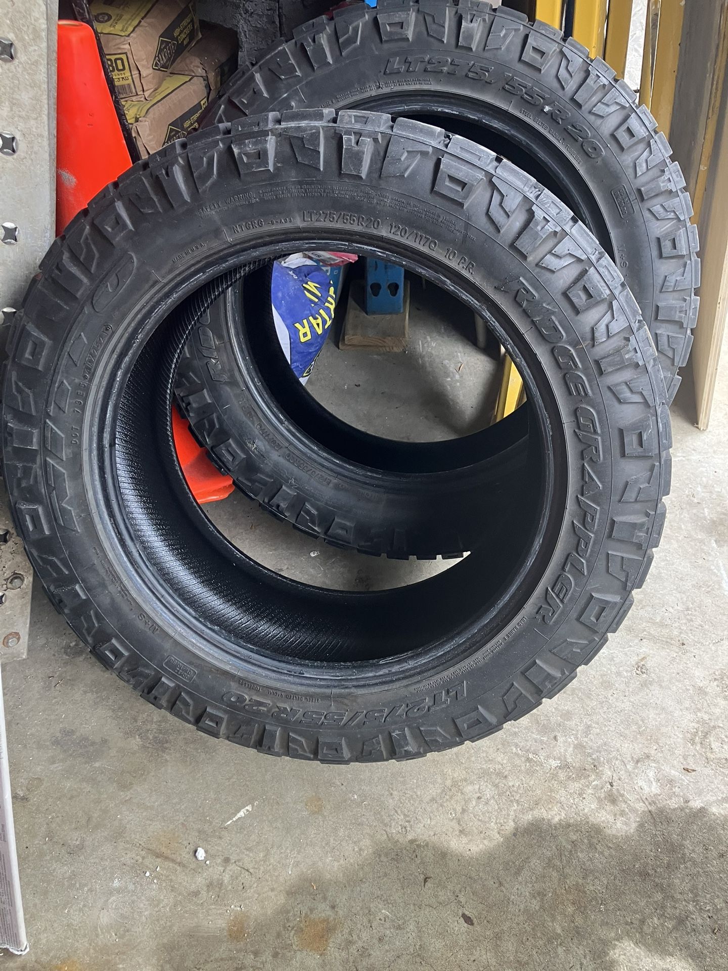 Nitto Ridge Grappler tires. These are LT275/55R20 size, has really good tread still. Looks like they haven't been used much. Selling as a pair.