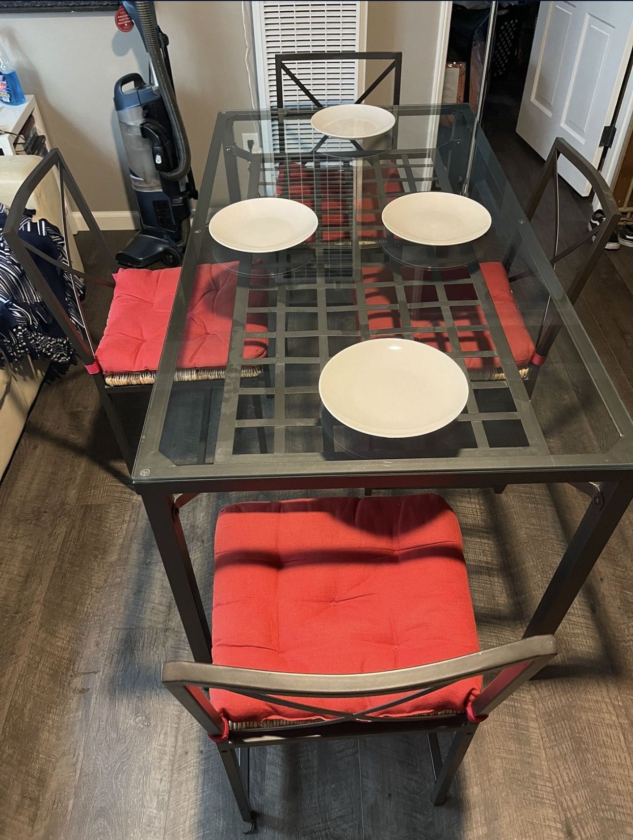 Outdoor table with four chairs. Used as a dining table inside so is in great condition. Dimensions 59Lx30.5Wx30 First come, first served.