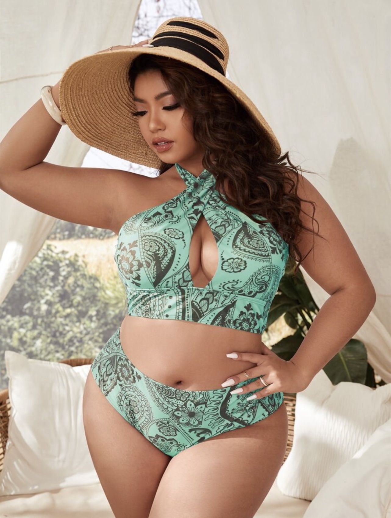 Plus Size Allover Print Criss Cross Halter Bikini Swimsuit XL 1XL 2XL 3XL 4XL