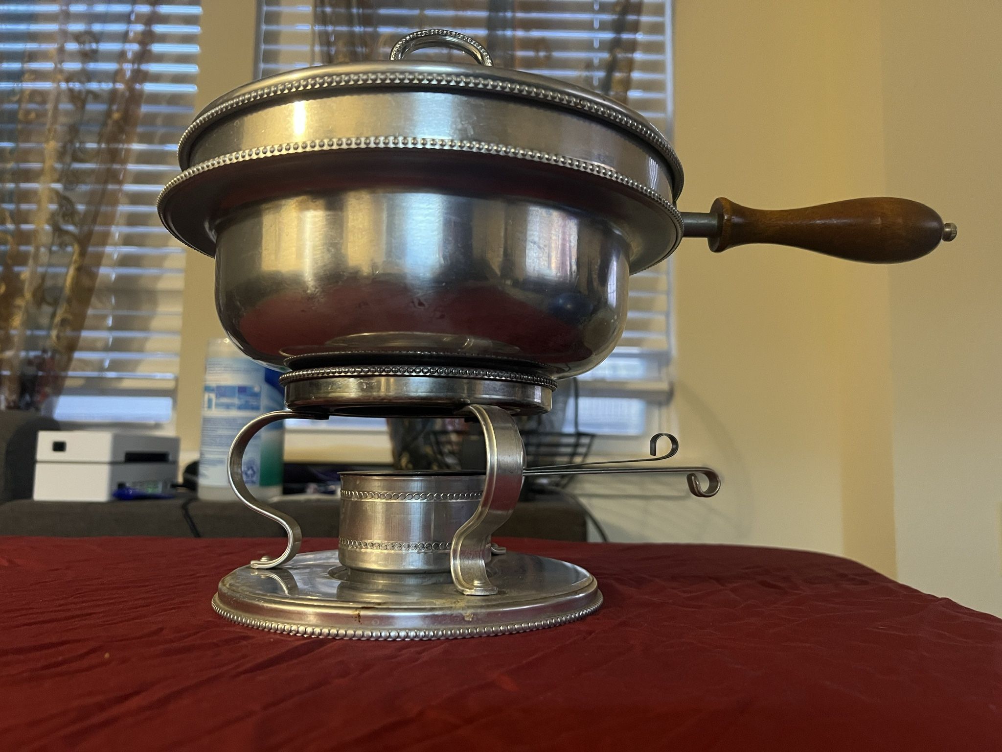 The Buenilum 5pc. Chafing Dish Food Warmer is a stylish and practical serving piece with a round shape and a capacity of 2 QT. Made of aluminum with a silver color, it exudes a mid-century and Victorian vibe with its wooden handle design. This chafing dish warmer is perfect for keeping food warm and fresh while adding a touch of vintage charm to any dining table or entertaining setting. Lid fits both pots making it a multitasking set. Use either one for serving food in their own or use all 5 as a chafing dish set. Small pot on the bottom will hold your candles for your heat source.