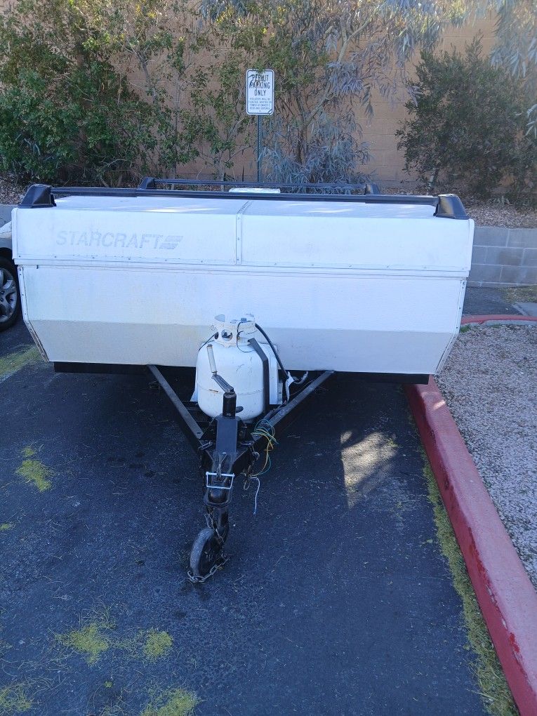 Hello I got my pop up trailer camper for sale its a 1994 starcraft that sleeps up to 6 one queen bed and one full bed it has a sink fridge 2 burner stove dinette table That turns into a twin bed it gots a roof rack lots of storage space all the lights work very easy to tow anything with a tow package will be able to tow it's about 15 to 17 feet long. When its opened closed about 9 feet long 4 feet wide about 700 pounds clean title no rips in the canvas all the zippers work fine it has a awning for shade no leaks im asking $1700 obo message me for more info thanks