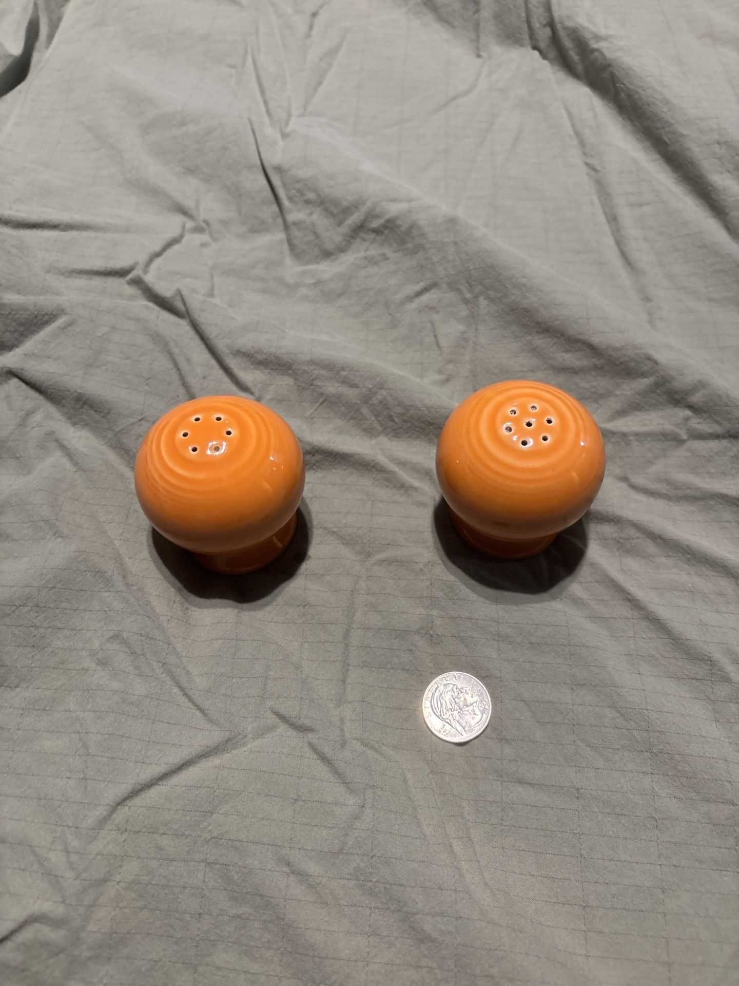 Authentic vintage Fiesta Ware salt & pepper shakers in orange. Clean condition, no chips or cracks. Classic collectible pair. Size shown with quarter.