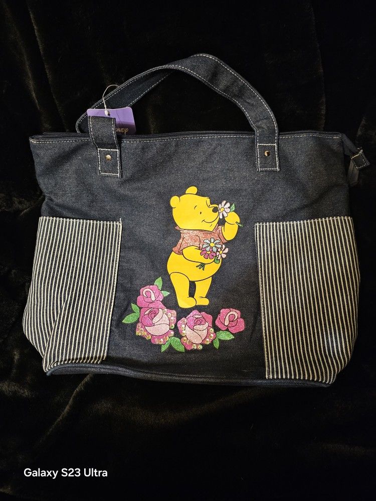 Adorable Winnie the Pooh denim tote bag. Has glittery rose details and striped side pockets. Inside has a zipper pocket and a slip pocket. New with tags.