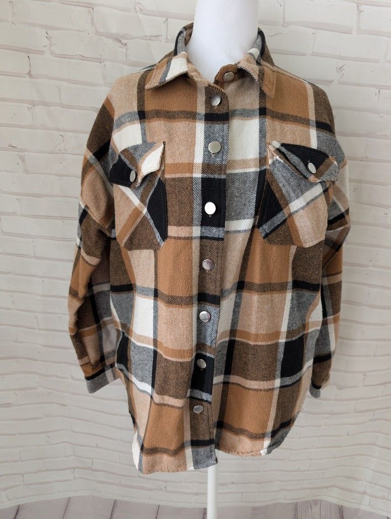 •Stylish plaid button-up shirt jacket with chest pockets. • Features a mix of tan, black, and cream colors. • Good condition with no flaws, normal was wear. •Pick up between Higley and Elliot