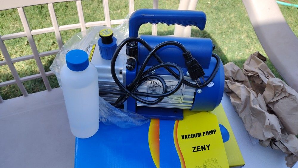 ZENY 3.5CFM Single-Stage 5 Pa Rotary Vane Economy Vacuum Pump 3.5 CFM 1/4HP Air Conditioner Refrigerant HVAC Air tool R410a 1/4" Flare Inlet Port, Blue Inlet Port: 1/4" Flare, Warm note: 1)Pressure Scale:0~400psi, 0~140psi 2)Length of hose:1.2m Red:1/4''-1/4'' Yellow:1/4''-1/4'' Blue:1/4''-1/4'' Please make sure your manifold gauge is in accordance with this size. Any question in using, please contact seller first. *** A self-paying vacuum pump Adapter needed if inflet not suitable High Efficiency and Low Noise, Heavy-duty Aluminum Alloy Casing, Oil Drain Plug Positioned at Bottom of Oil Reservoir,Internal High Volume Cooling Fan for Extended U Exhaust Port with Exhaust Cap, Direct Drive Motor Allowing Easy Starting Which is Maintenance Free Oil Sight Glass For Monitoring Oil Levels, ON/OFF Switch Non Slip Cushion Handle, Comes With a Bottle of Vacuum Oil