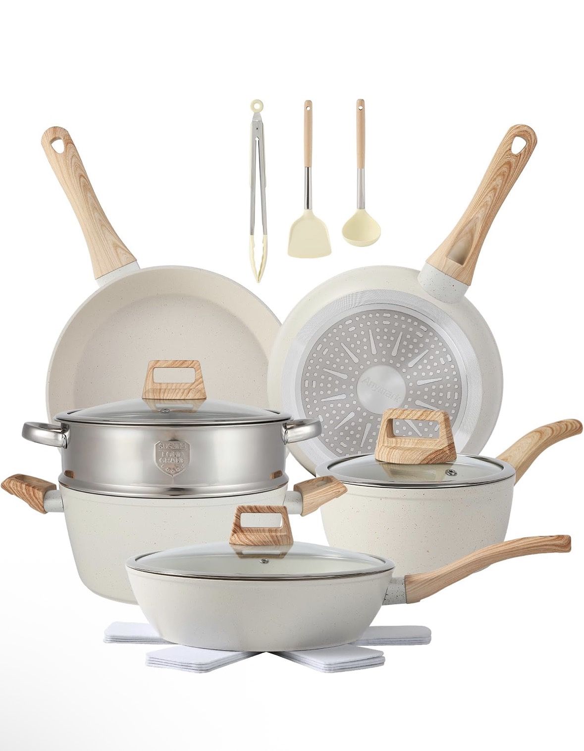 NEW IN BOX NEVER OPENED OF USED 16PCS Pots and Pans Set Non Stick】16PCS Pots and Pans Set Non Stick with a 9-inch/11 inch fryer, a11 inch/4.5QT covered fryer, a 4.3 QT covered steamer, a 1.5 QT covered stewer, and a silicone spatula and pliersand 4 reusable pot protectors perfect for your daily cooking. 【 Rapid & Even Cookware Set】nonstick cookware set with a durable aluminum core, the pot heats up quickly and provides a better and even experience 【Durable Bakelite pots and pans】pots and pans with Durable Bakelite Avoid scalding fingers transparent lid of the pot makes it convenient for you to check the process of food at any time 【Easy Cleaning Nonstick Pots and Pans Set】Nonstick Pots and Pans Set Easy to clean and maintain. Simply wipe with a tissue or rinse with water