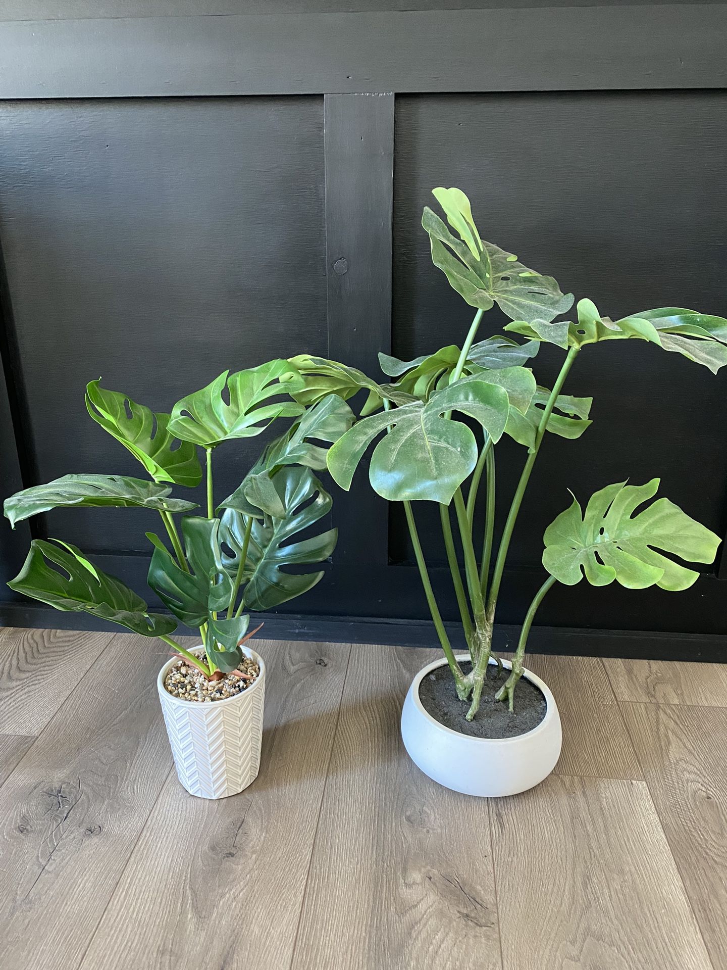 I have two artificial monstera plants. Both for $30 price is firm The smaller one is about 20”h and 5” vase diameter Bigger one is about 25”h and 9” vase diameter