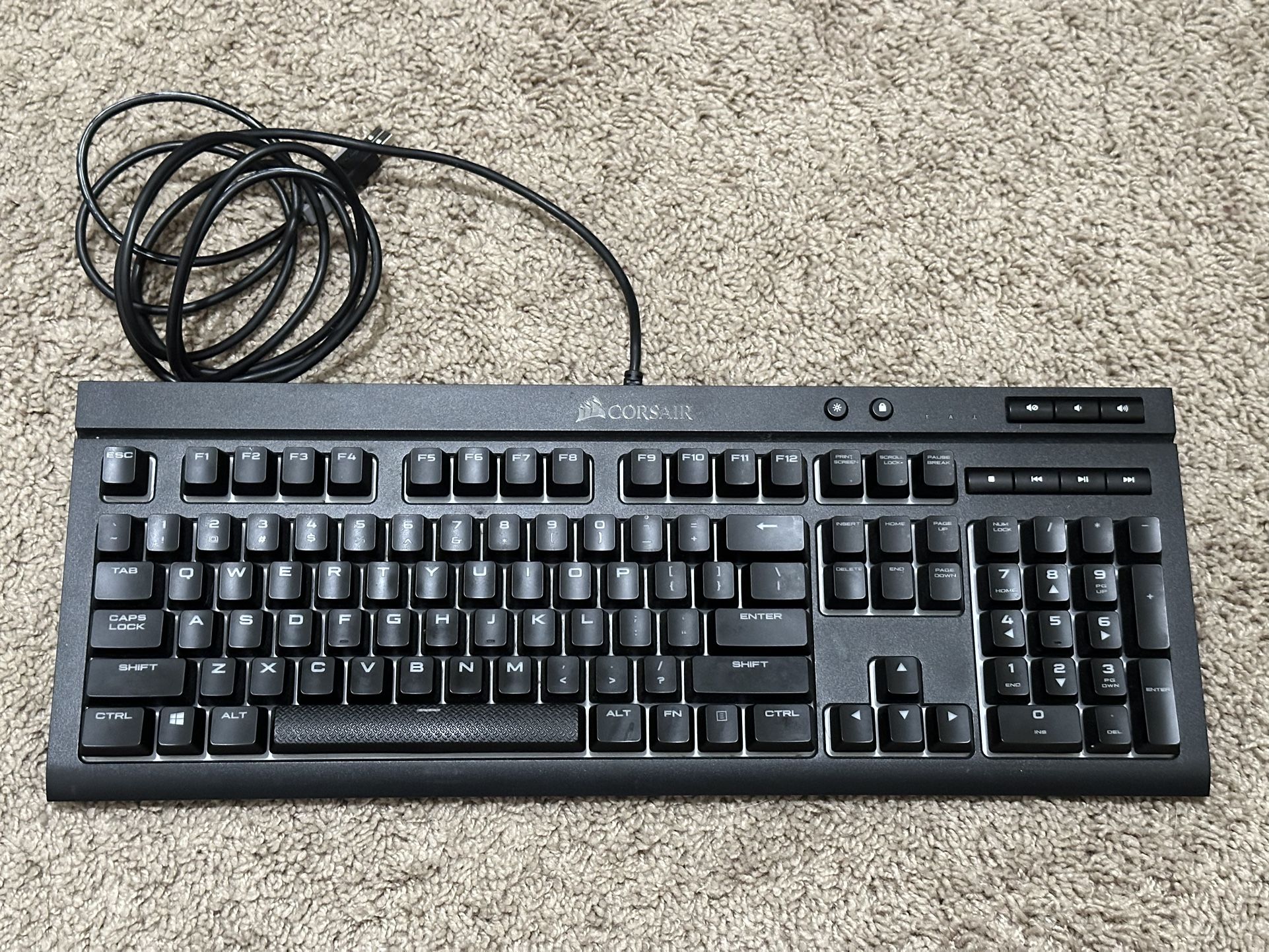 Corsair K68 Mechanical Keyboard with Cherry MX Red Switches. The keyboard is backlight and works with the iCue software so you can customize any key to any color you like. It is a USB keyboard and was used for less than a year.