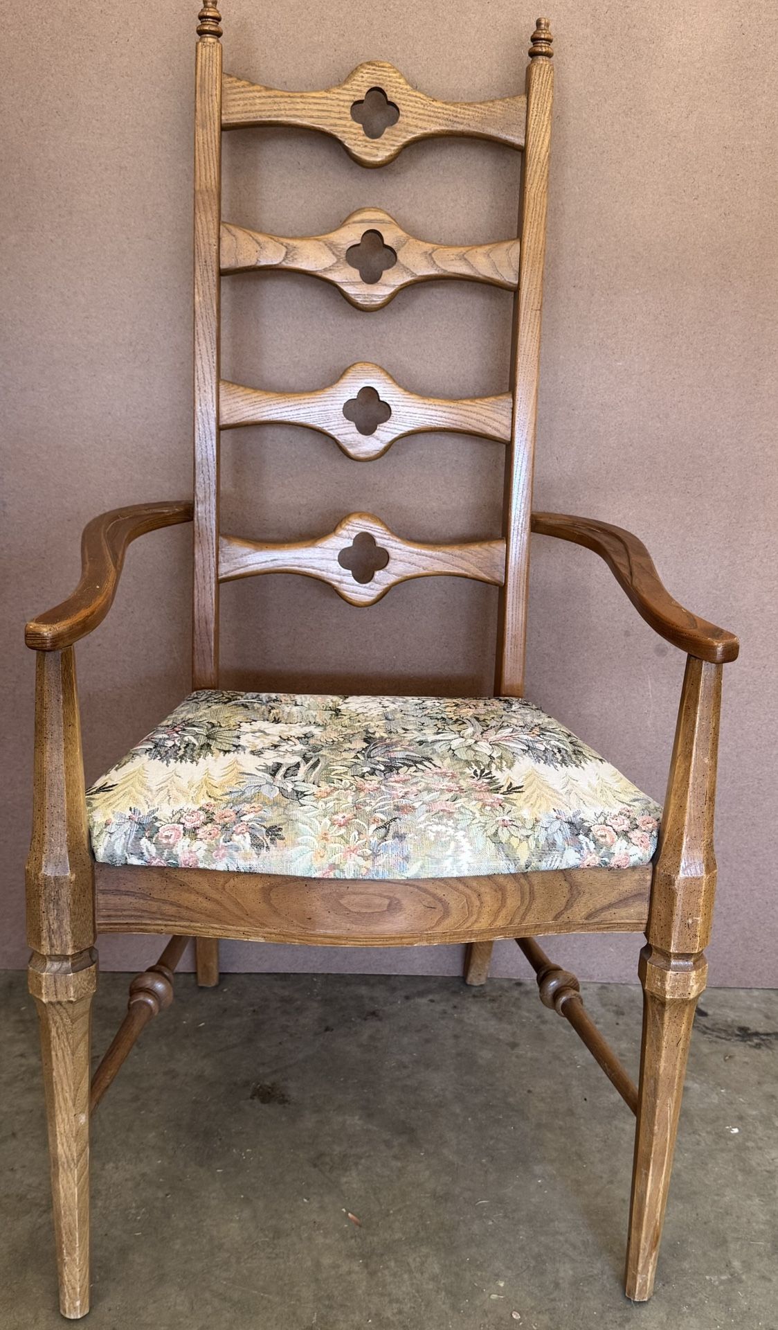 Wooden chair featuring a floral patterned seat. Light padding. Set of 6, 2 with arms and 4 without. 18” deep x 22” wide x 27” high. From family estate clean out.