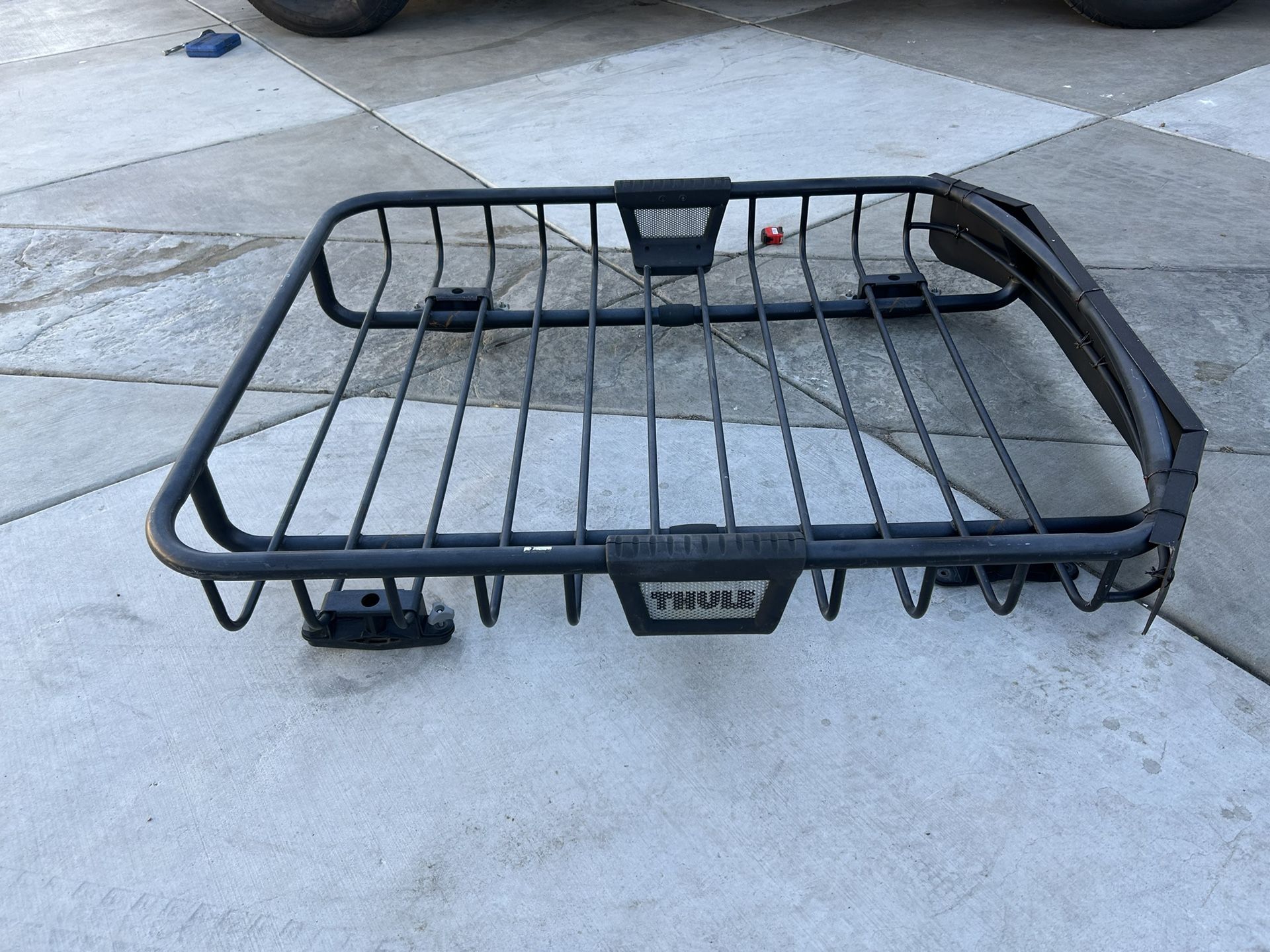 Thule roof rack, had it on my tahoe but it was too small 50 inches long and 41 inches wide Originally it didn’t come with a wind flaring panel so i made my own, it’s removable