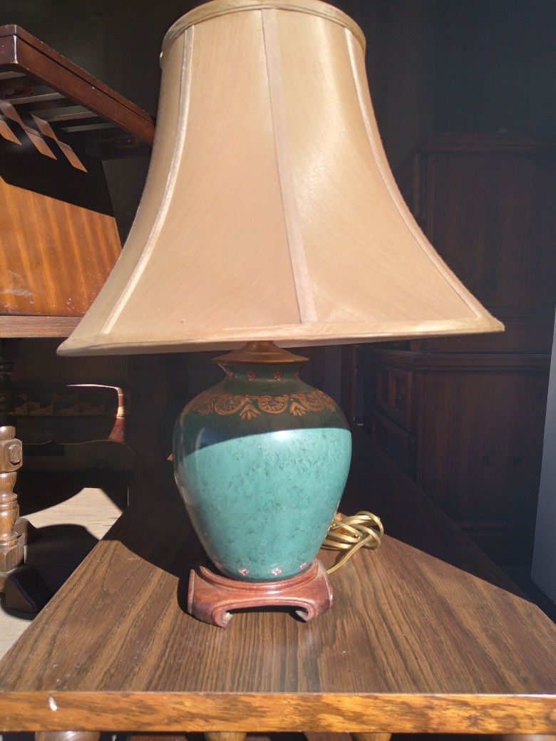 Great original vintage turquoise lamp with gold and pink ornate flowers and a nice wood base. The lamp is about 12 inches tall and works great. Overall very nice condition