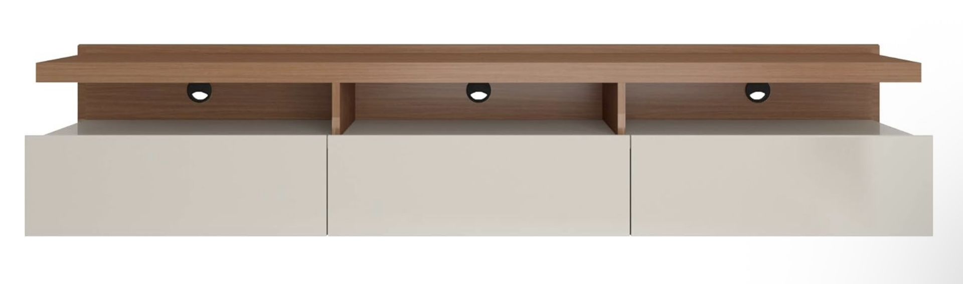 TV stand with a low-profile design. Features ample storage space for electronics, media devices, and accessories. Clean aesthetic that works well in contemporary or minimalist spaces. Multiple storage compartments • Cable management openings • Sturdy construction • Neutral finish that pairs well with most decor Minor scratches visible in photos