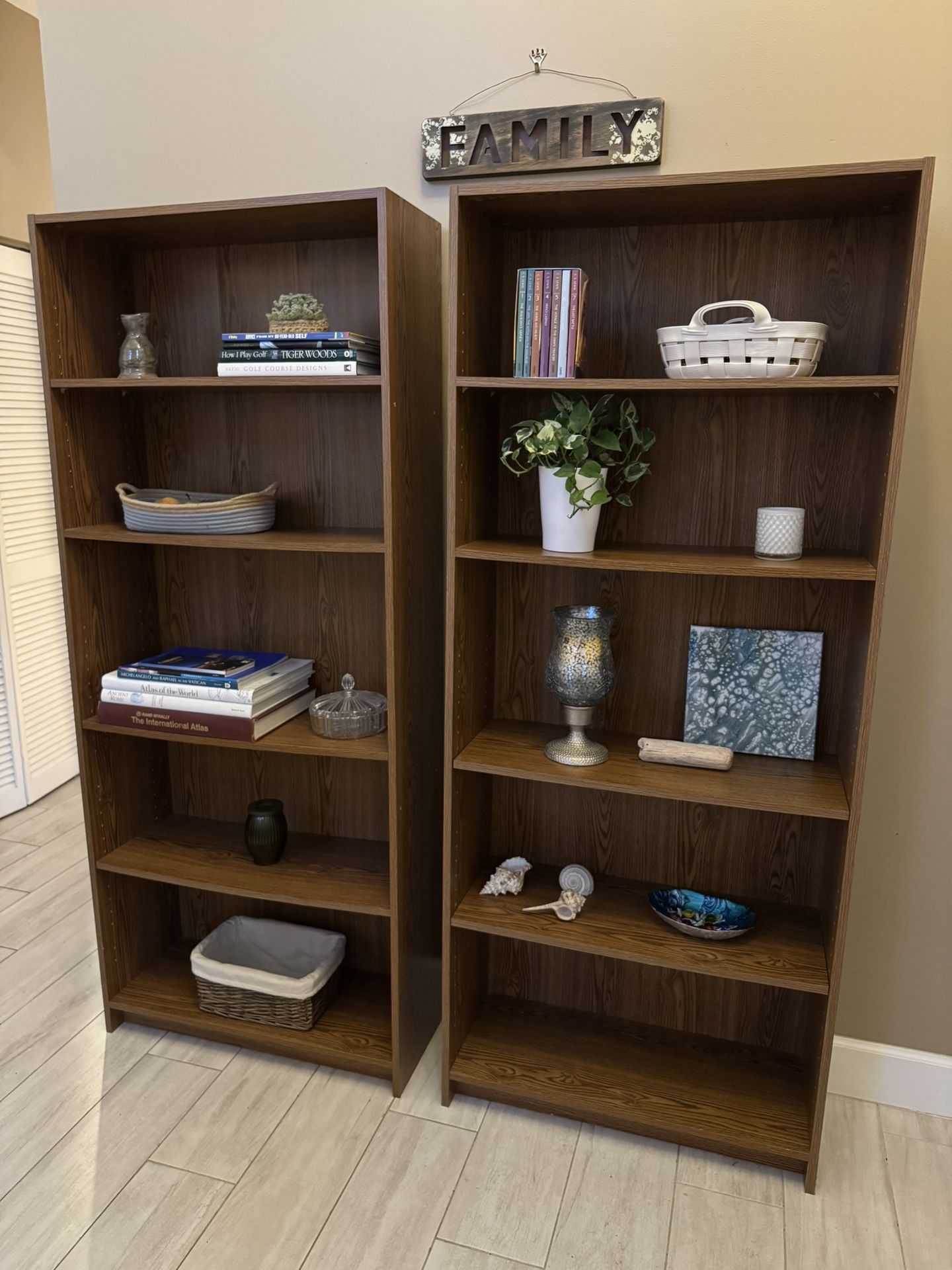 Set of 2 Matching Bookshelves - Great Condition Solid, sturdy matching bookshelves with a warm wood finish. Clean and well cared for. Perfect for: • Living room • Office • Bedroom • Playroom Simple design that works with almost any décor. Can be used together or separately. *Decor not included. Each bookcase is: 6 feet tall 21/2 feet wide 1 foot deep $35 each or $60 for the pair (priced for a quick sale) Moving sale- priced to sell quick! Pick up in Weston
