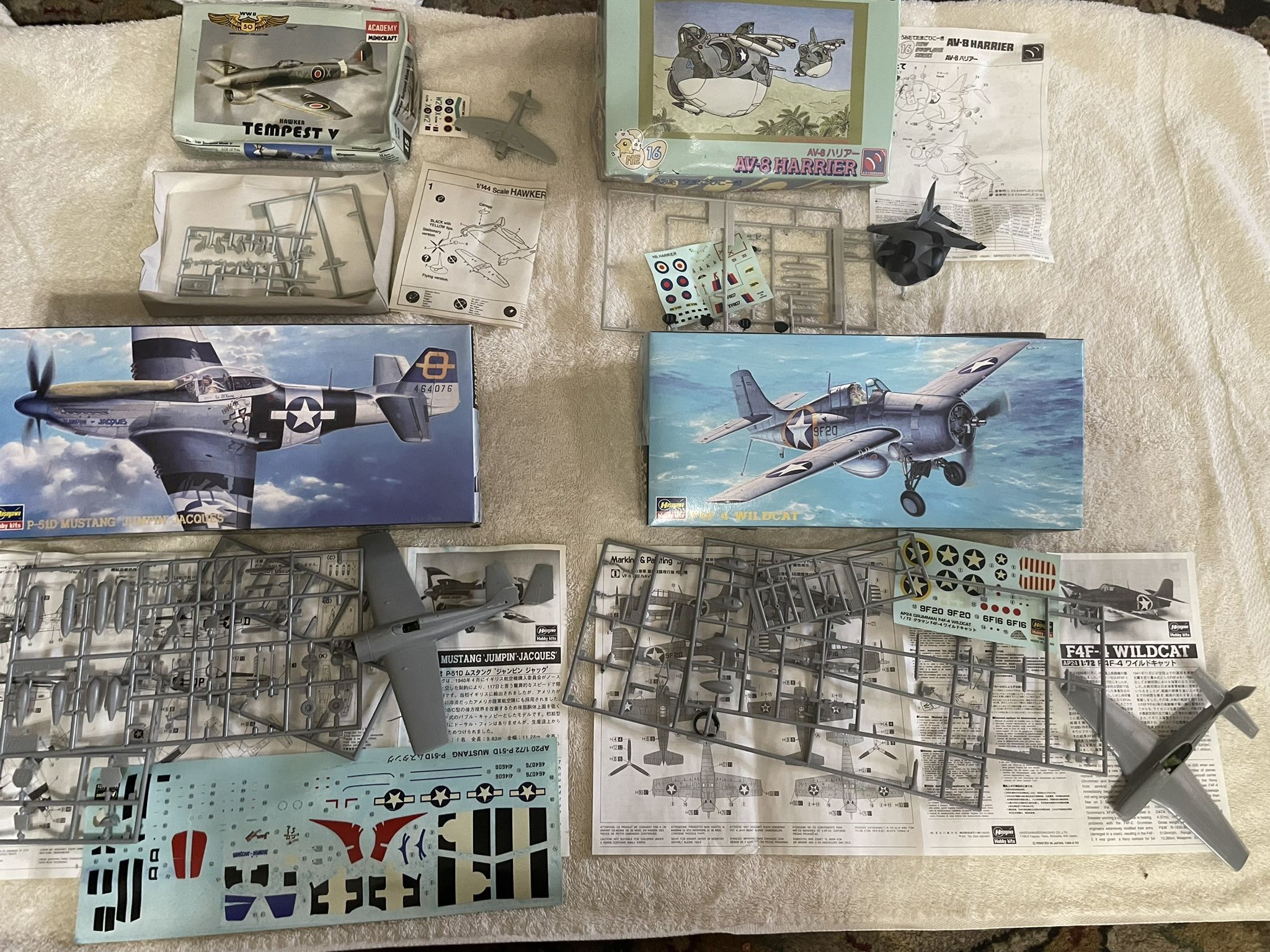 Set of 4 Vintage Collectible Airplane/submarine model kits, partially put together still some pieces to add and all have the sticker sheets. All are as is, I can’t guarantee they’re 100% complete, but all the boxes were closed and include original instructions. Selling as lot. #1: Hasegawa P-51D Mustang 'Jumpin'-Jacques' in 1:72 scale. A long-range bomber escort and considered a premiere US fighter aircraft of WWII. #2: Hasegawa 1/72 scale Grumman F4F-4 Wildcat plastic model kit. model aircraft kit #3 Hasegawa "Eggplane" AV-8 Harrier and an Academy/Minicraft Supermarine Hawker Tempest Mark V kit. #4: Academy Minicraft Supermarine Hawker Tempest Mark V (Kit No. 4415): A 1/144th scale model kit of the Hawker Tempest Mark V fighter aircraft, box is bent up.