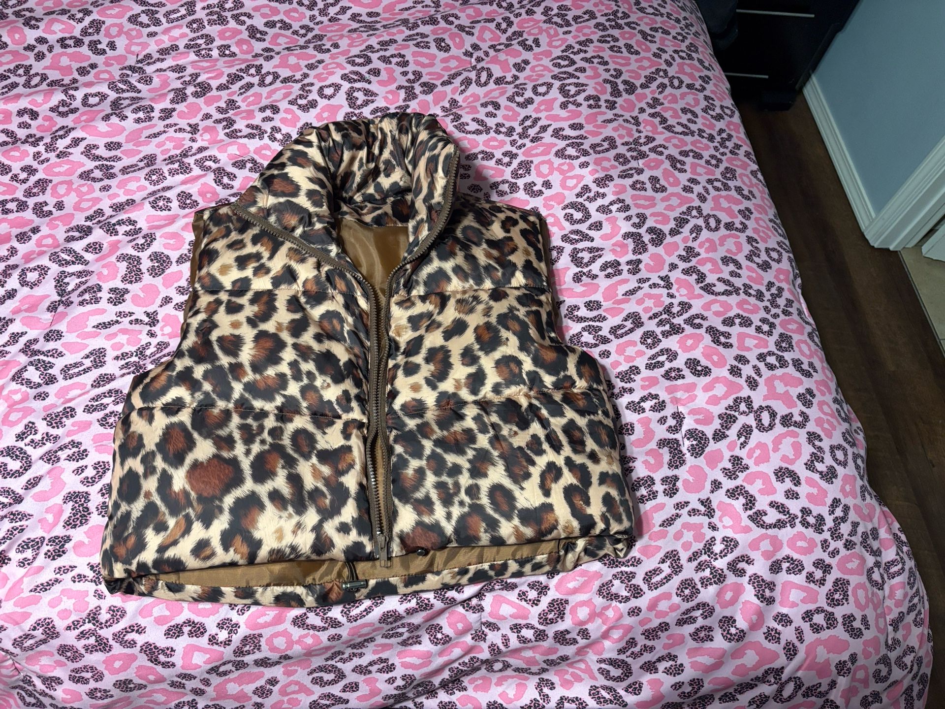 Stylish leopard print puffer vest. Sleeveless design. Perfect for layering.