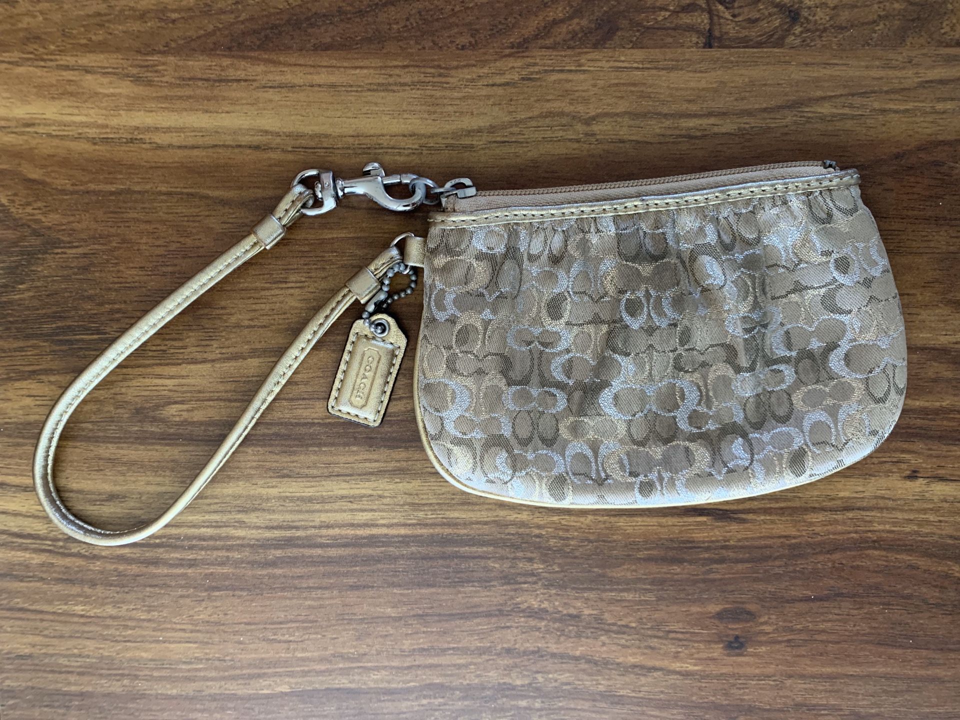 Light Tan Coach Brand Wristlet. Multiple little Coach C’s (bit of a sparkle to it). 6 1/4” wide and 4” high. $15 OBO