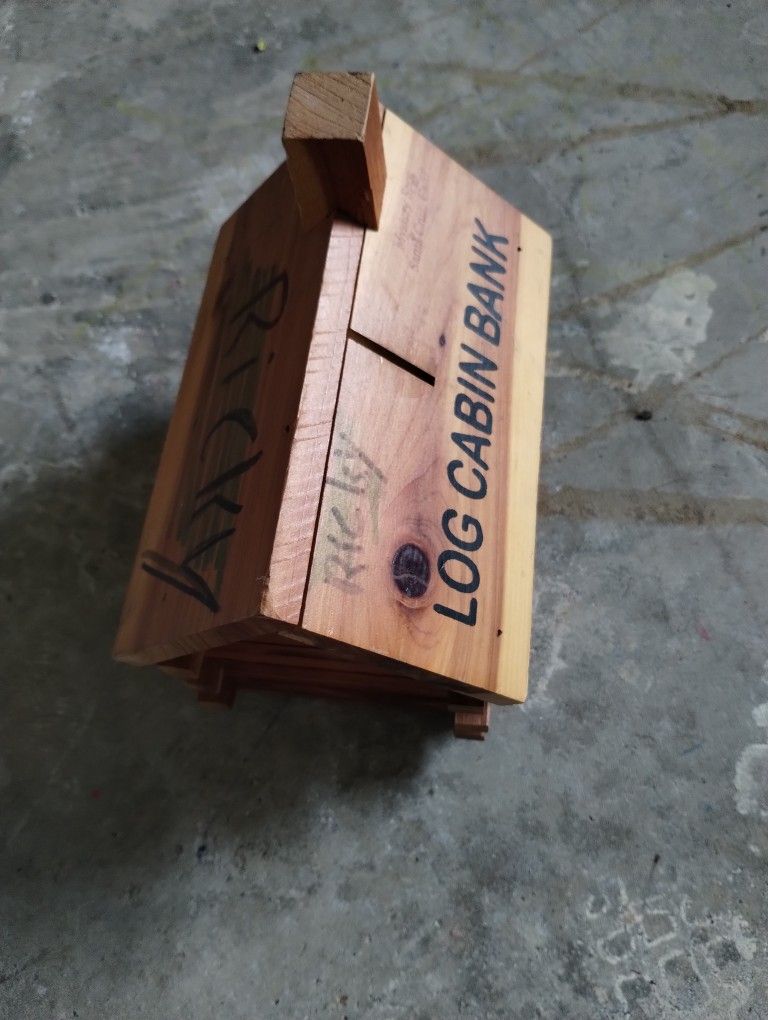 Kids piggy bank. Log cabin style. Used but just need to be painted and is good as new.
