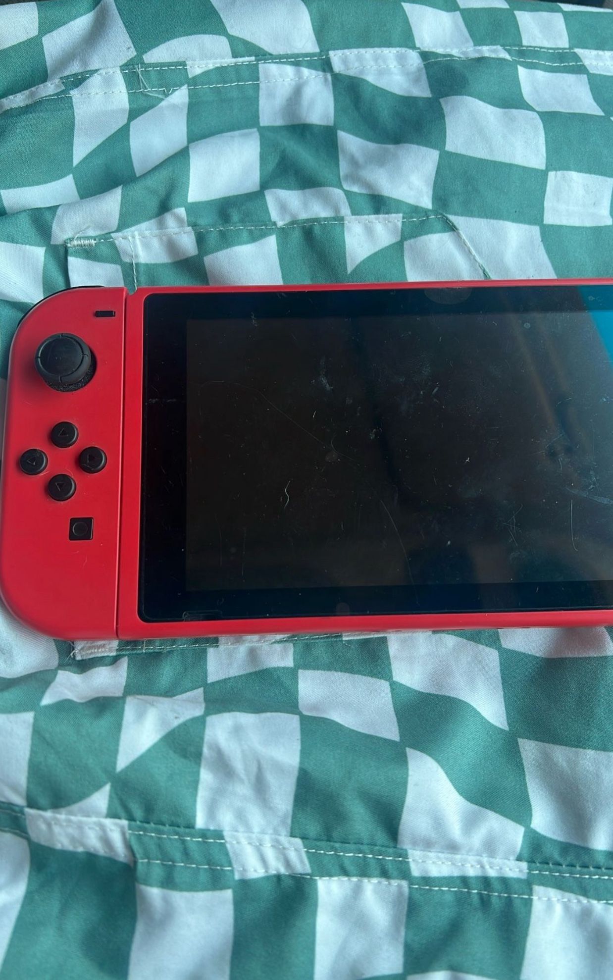 Fully red Nintendo switch only used a couple times comes with screen protector so no actual scratches on the screen, has just been in my storage room