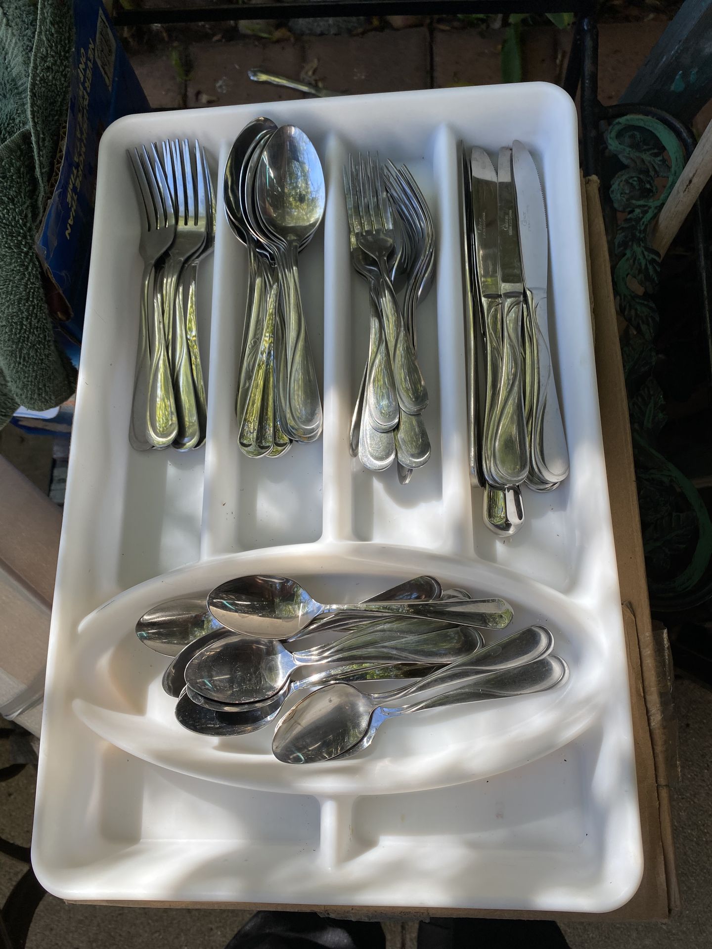 Mostly complete- (8) missing a few small forks, spoons Nice. Also steak knives and a few serving utensils. Includes drawer insert pictured. Perfect for first apartment or extra silverware.π