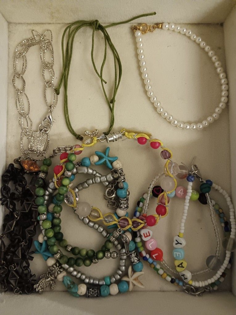 Different types from bracelets, necklaces,rings from $10, $15 small and large bags available
