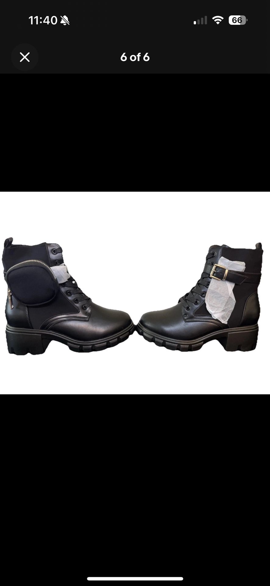 The Tanzi Brand Black Leather Boots with Mini Bags Attached in size 9 are stylish and versatile footwear for women. These ankle boots feature a round toe and block heel, perfect for casual occasions in the fall and winter seasons. The combat style design with attached mini bags adds a unique and fashionable touch to the black leather boots, making them a trendy choice for going out or outdoor activities. JustFab, the brand behind these boots, ensures quality and style for the modern woman looking to make a statement.