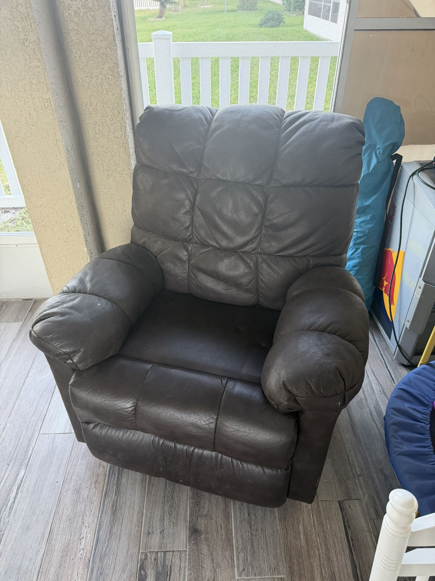 Older used recliner needs a good cleaning but still works nicely and is still comfy. It’s been on the back patio for a while now and doesn’t get used often and looking to sell.