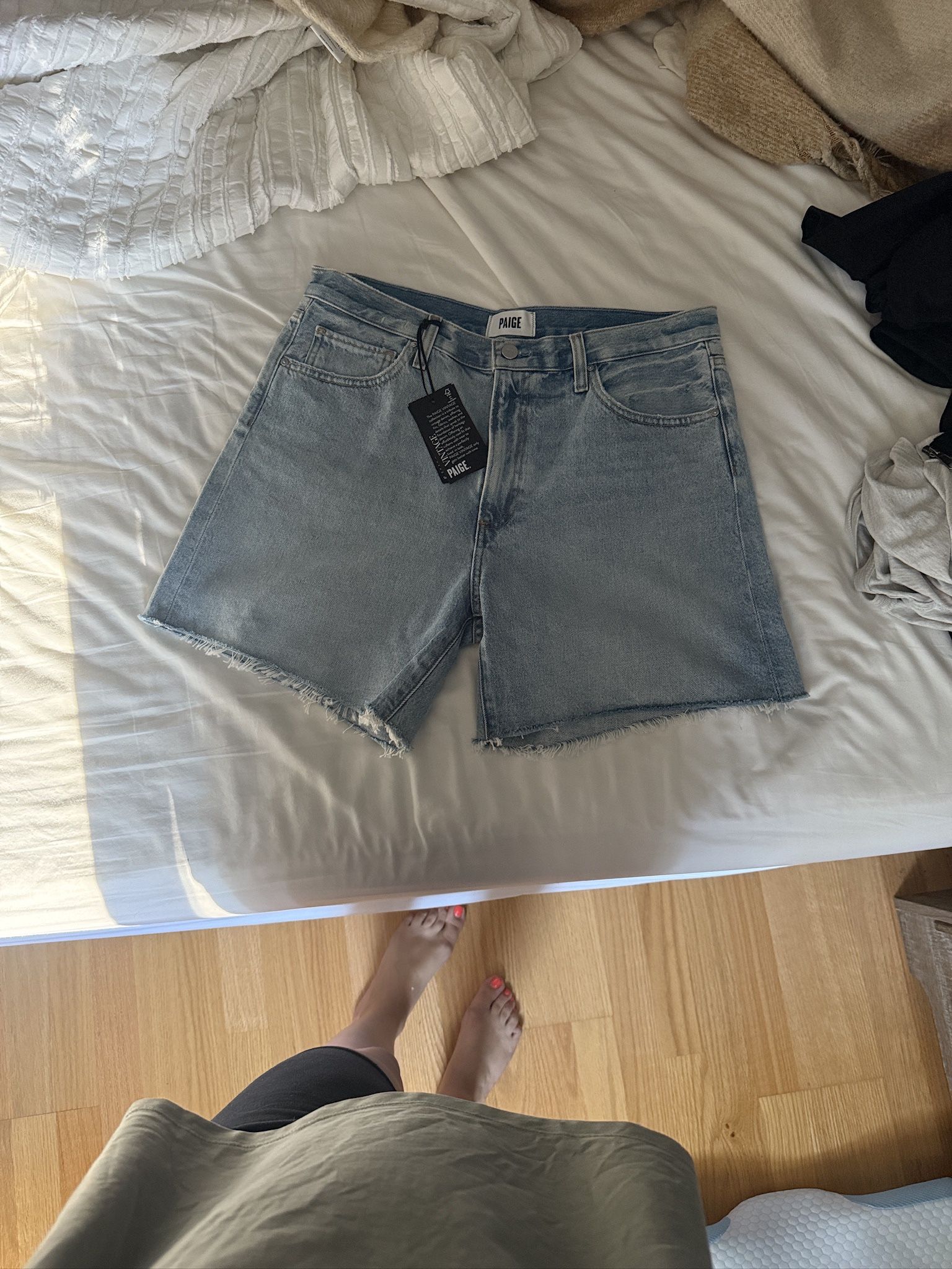 Stylish denim shorts with a frayed hem. Ideal for everyday wear. Never worn. NWT. Didn't return in time. Size 30 100% Cotton Rise: 11 3/4" Inseam: 6" Leg Opening: 24 5/8"